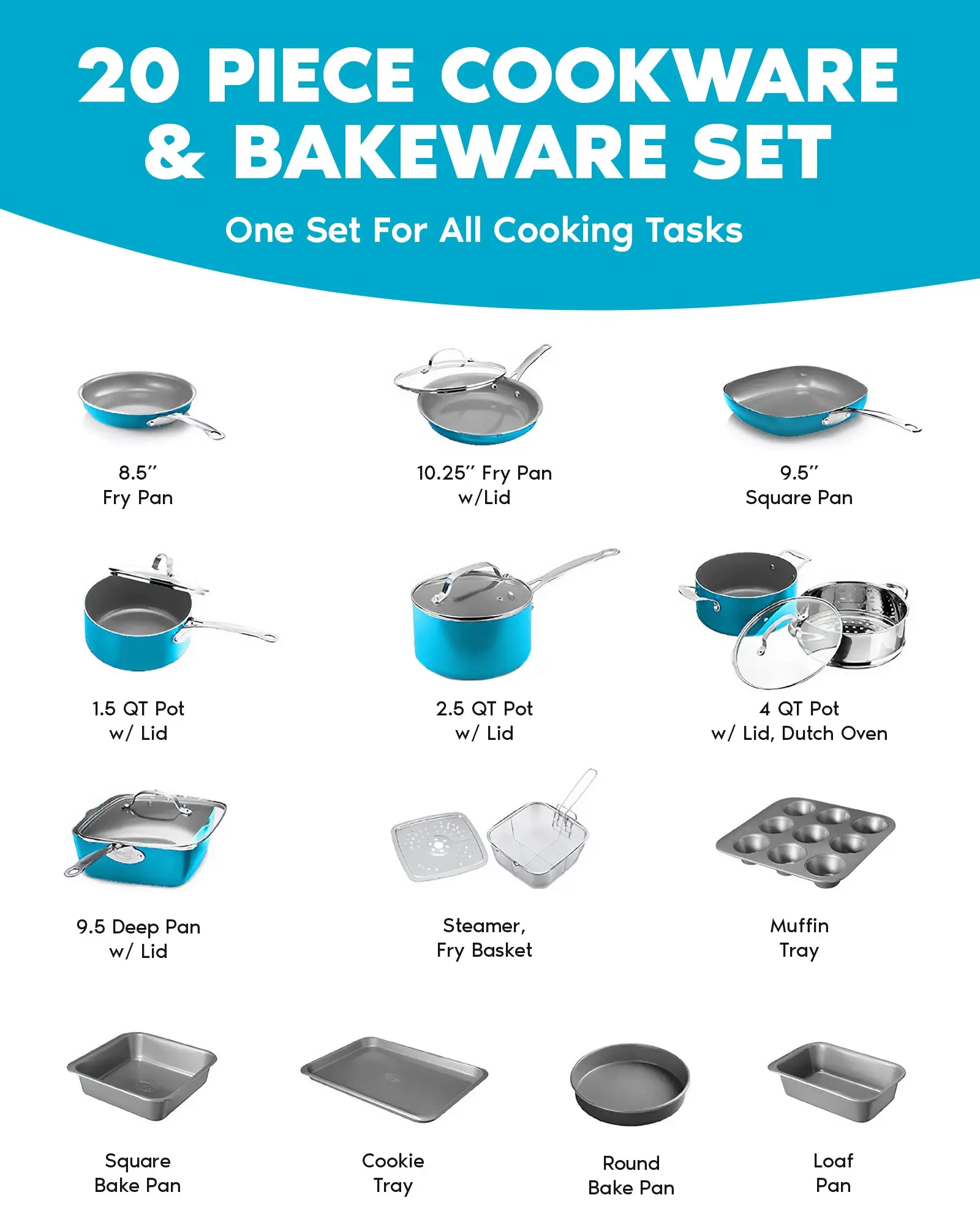 ·20 Piece Set: 8.5" Fry Pan, 10.25" Fry Pan, 9.5" Square Pan, 1.5Qt Pot with Lid, 2.5Qt Pot with Lid, 5Qt Pot with Lid and Steamer Insert, 9.5" Deep Pan with Lid, Steamer and Fry Basket, Muffin Tray, Square Bake Pan, Cookie Tray, Round Bake Pan, Loaf Pan