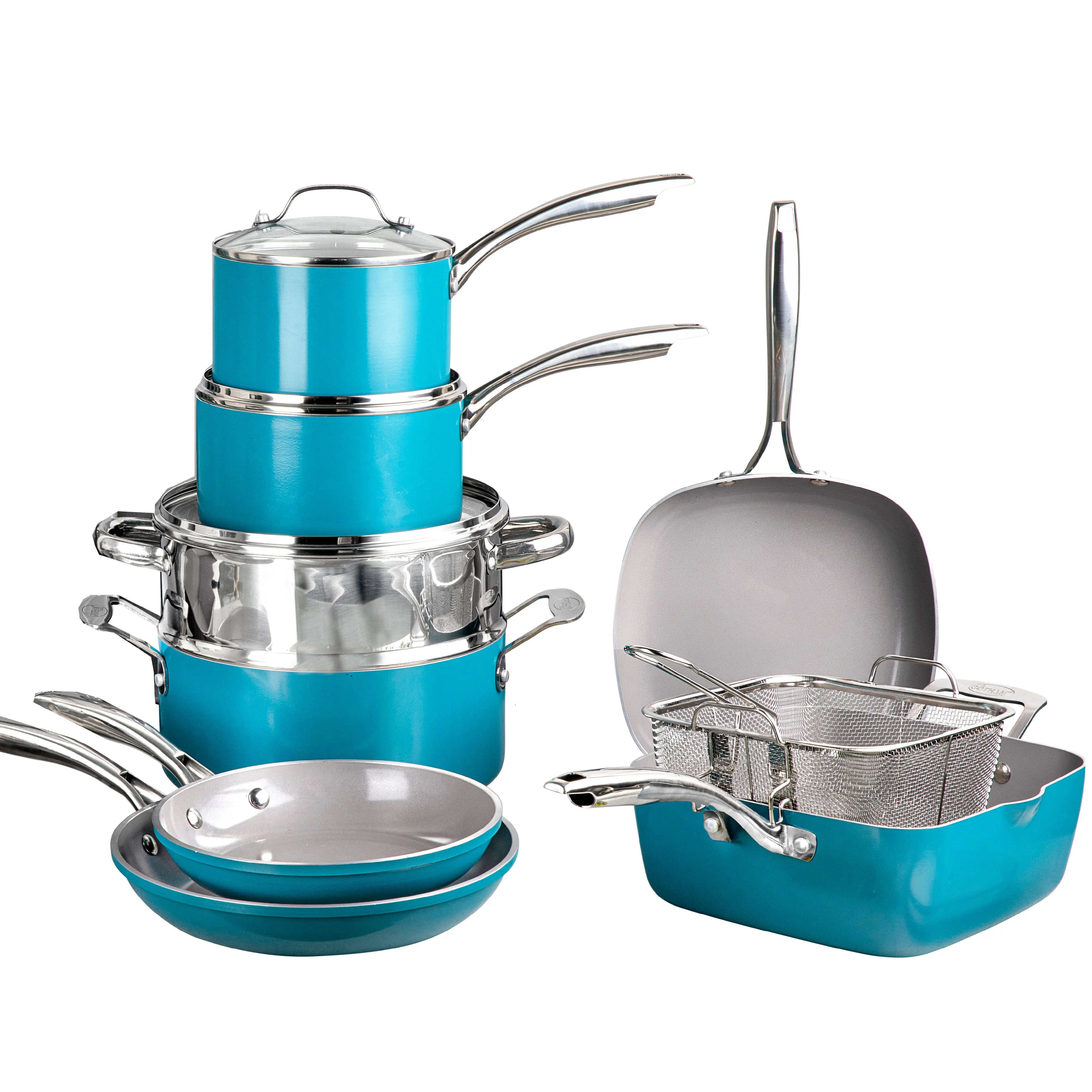 ·12 Piece Set: 8.5” Fry Pan, 10.5” Fry Pan with Lid, 1.5Qt Sauce Pan with Lid, 2.5Qt Sauce Pan with Lid, 5Qt Stock Pot with Lid and Steamer Insert, 9.5" Square Pan with Lid