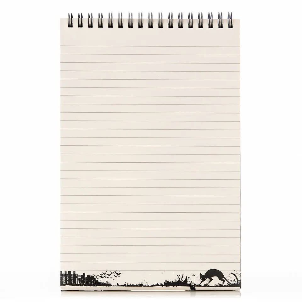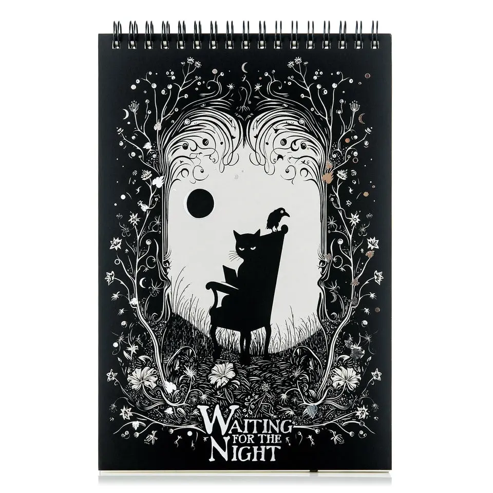 ·Waiting for the Night Top-Spiral Steno Notepad (6'' x 9''): 50 sheets of premium 60 lb. paper, spiral-bound on a sturdy backboard, with a silver-foiled front cover featuring a black cat and raven design. Ideal for notes, checklists, reminders, and planning.