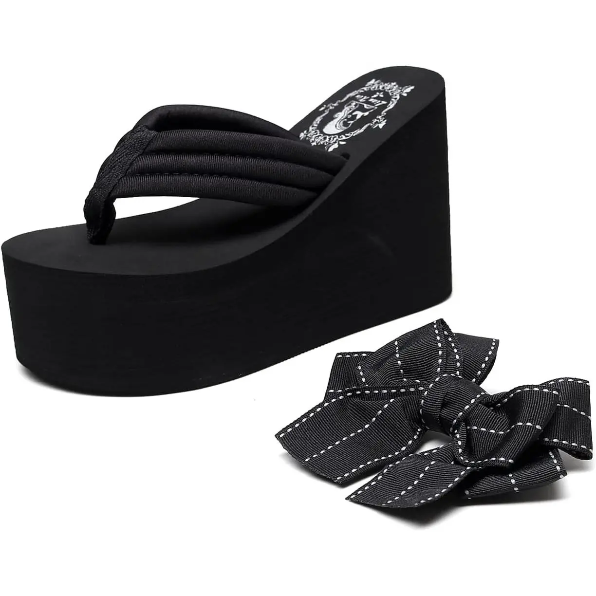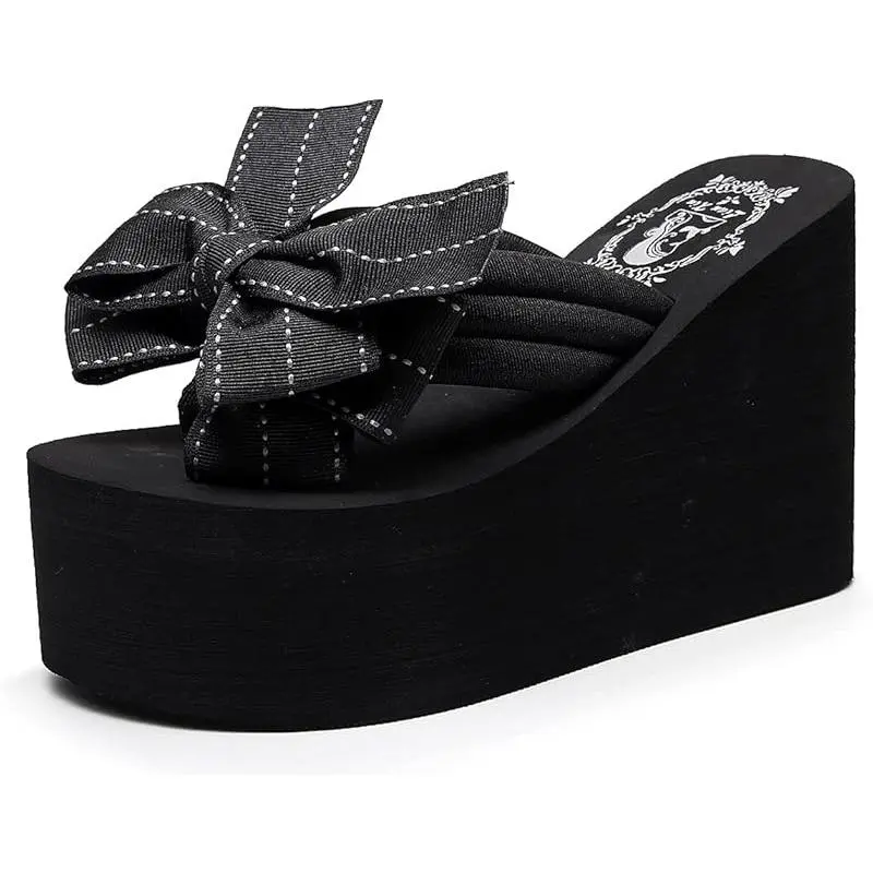 Momolove Womens Platform Flip Flops Gothic Sandals For Women Chunky High Heel Flip Flop Goth Wedge Slippers With Bowknot
