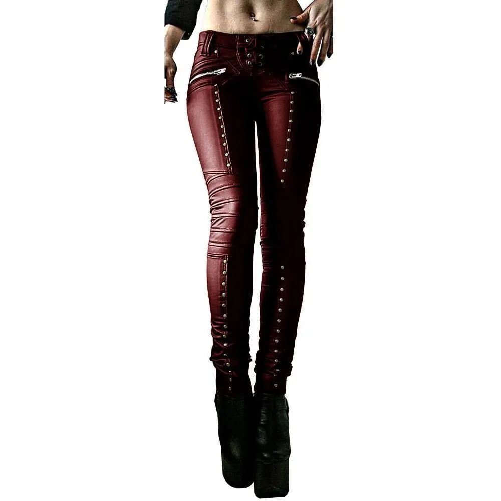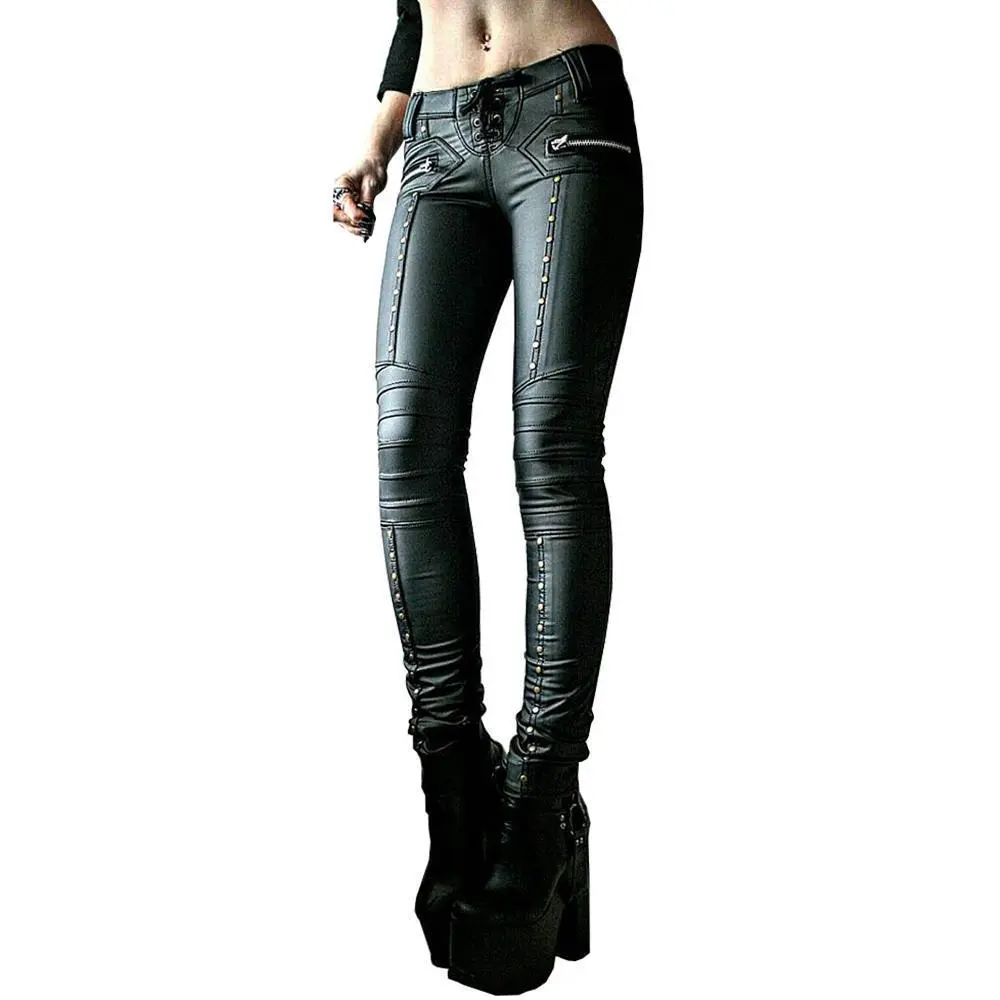 ·Feature: mid waist,lace up,slim fit,faux leather pants.Eyelet and studded decoration,heavy metal,goth punk pu leather leggings.Full length skinny moto leggings,Novelty and alternative pants cosplay costume.