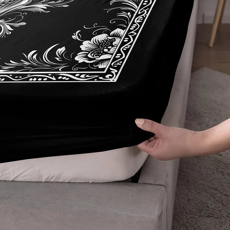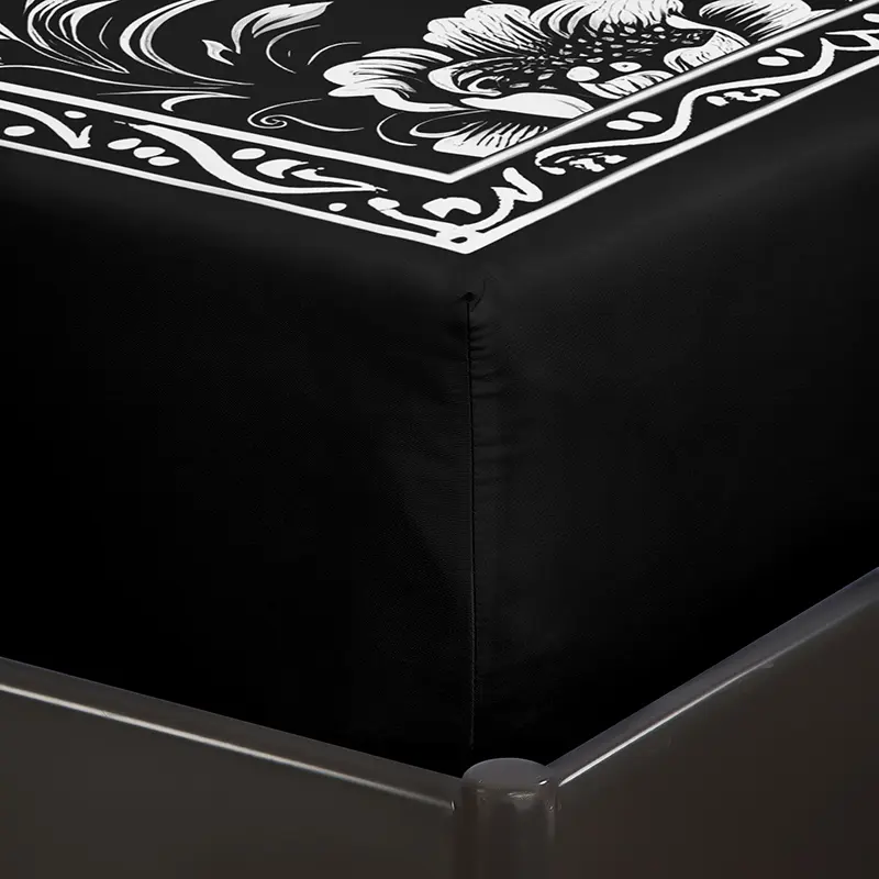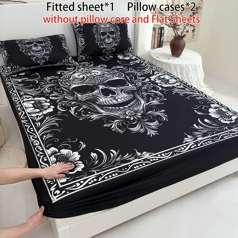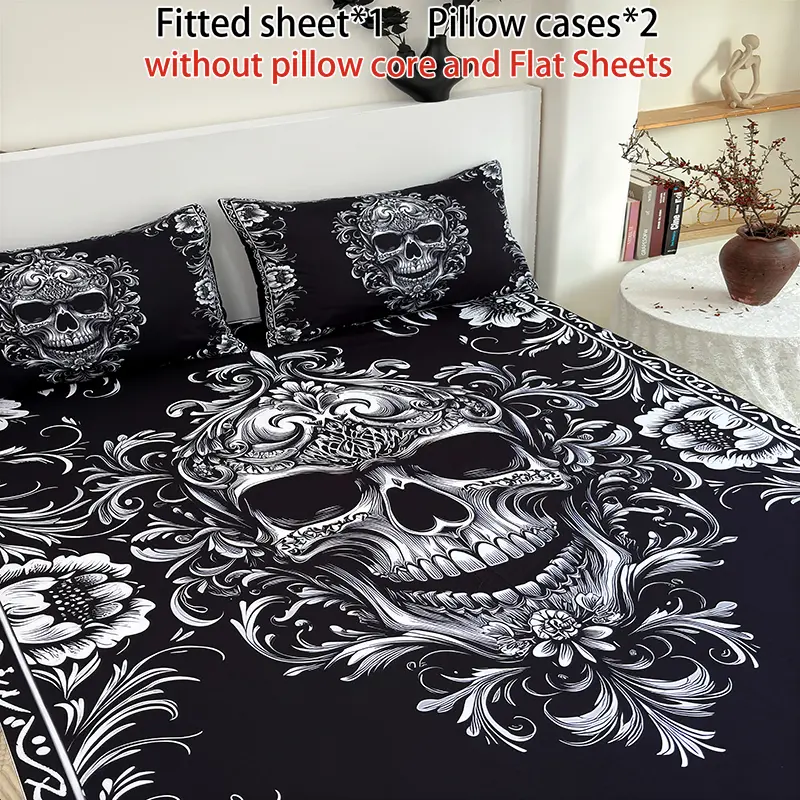 3 Pieces Black Skull Floral Fitted Sheet Set (1 Fitted Sheet + 2 Pillowcases without Pillows) High-Definition Digital Printing, Trendy Cool Bedroom Infused with Gothic Romance, Unlocks Niche Trendy Bedroom Style Bedding Accessories