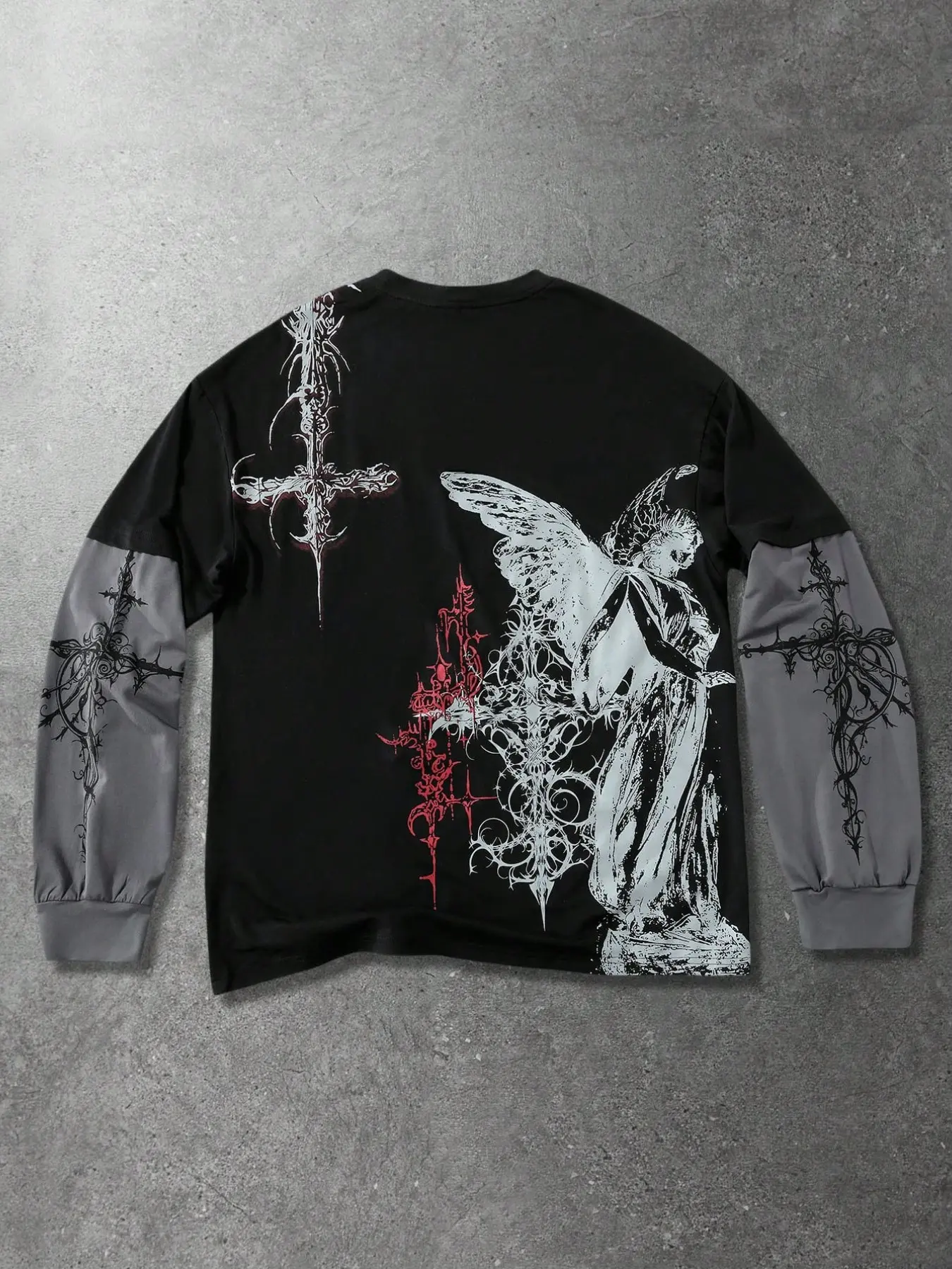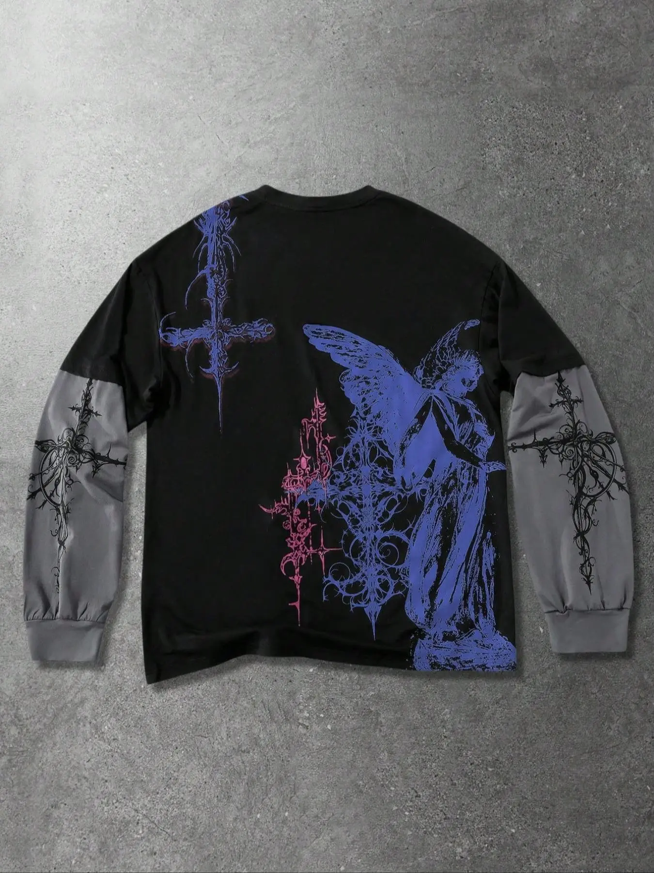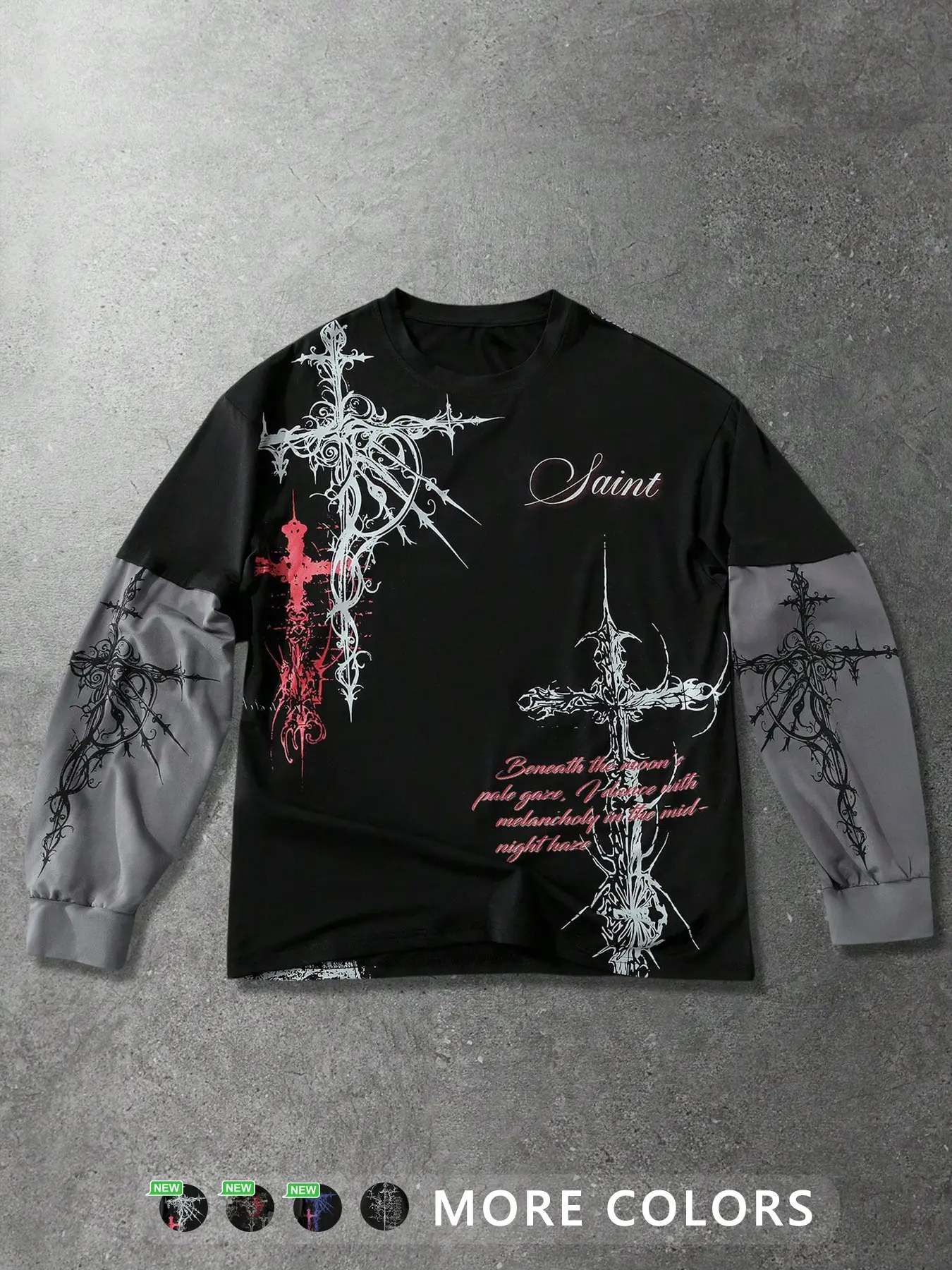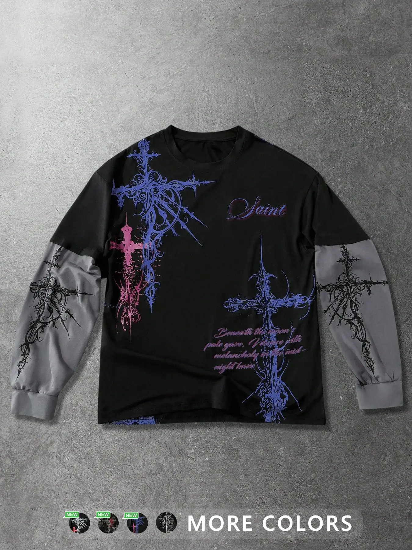 Unisex Gothic Style Long Sleeve T-Shirt with Rune and Cross Print, Ideal for Streetwear and Hip Hop Culture, Perfect Couple