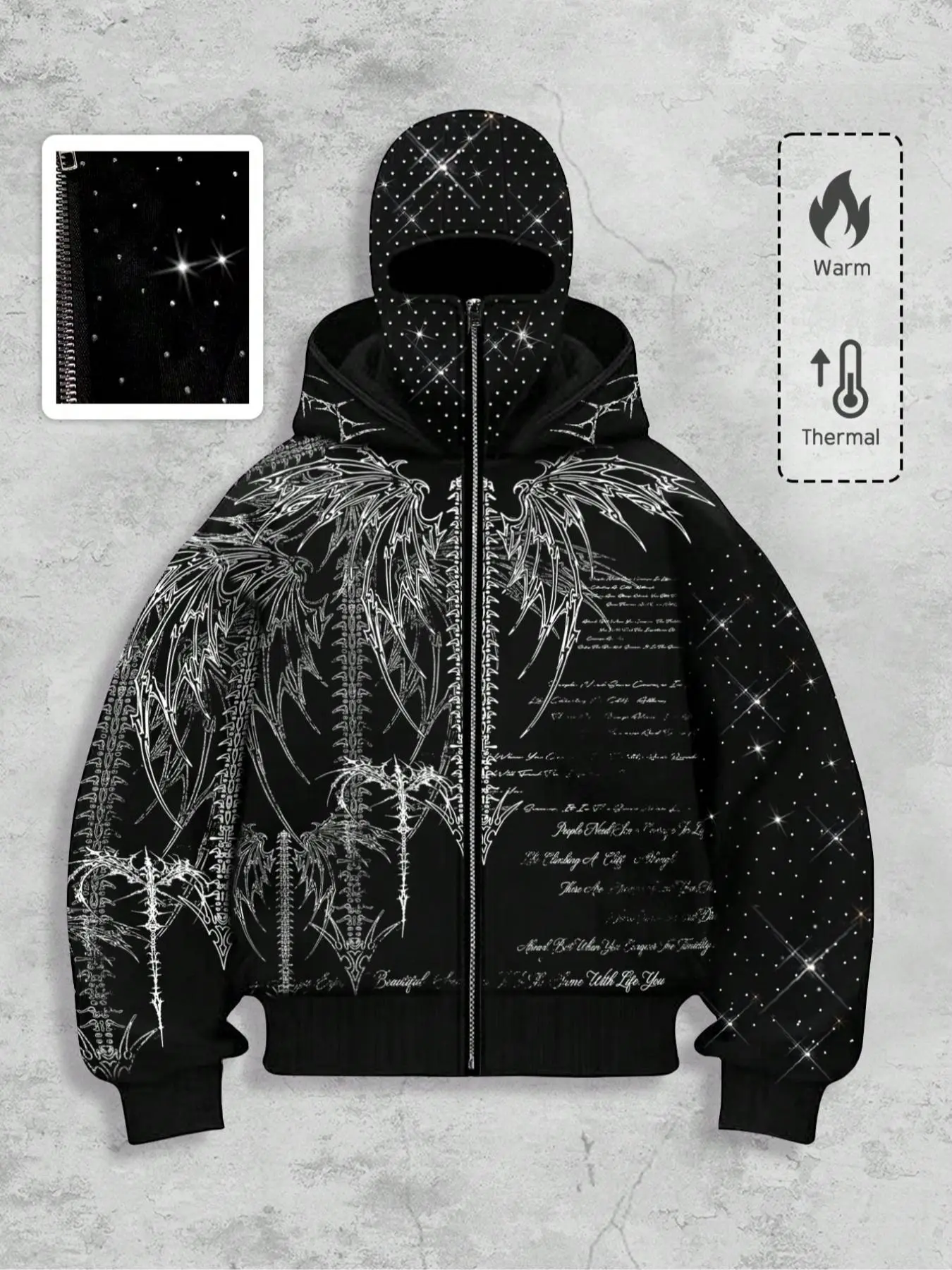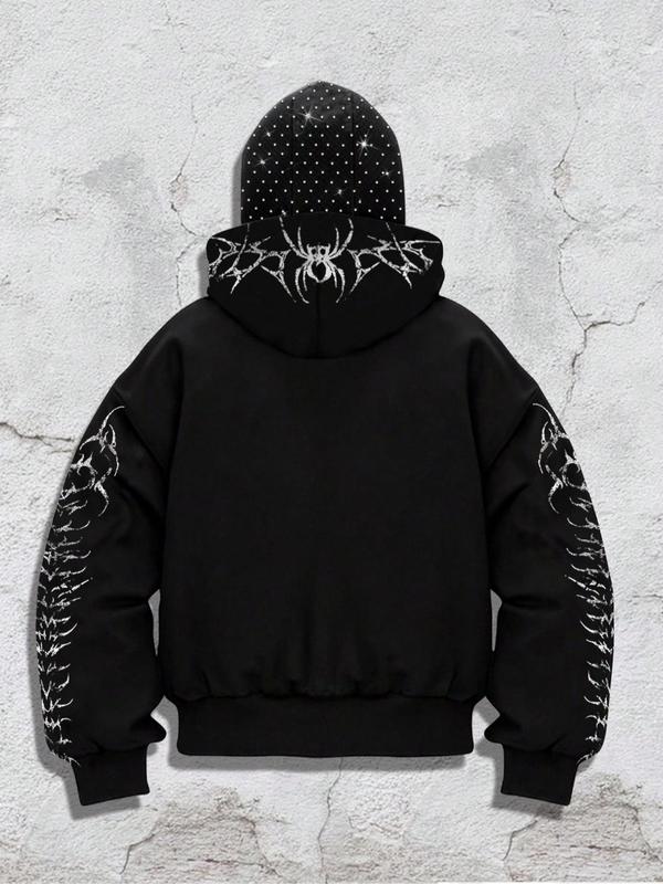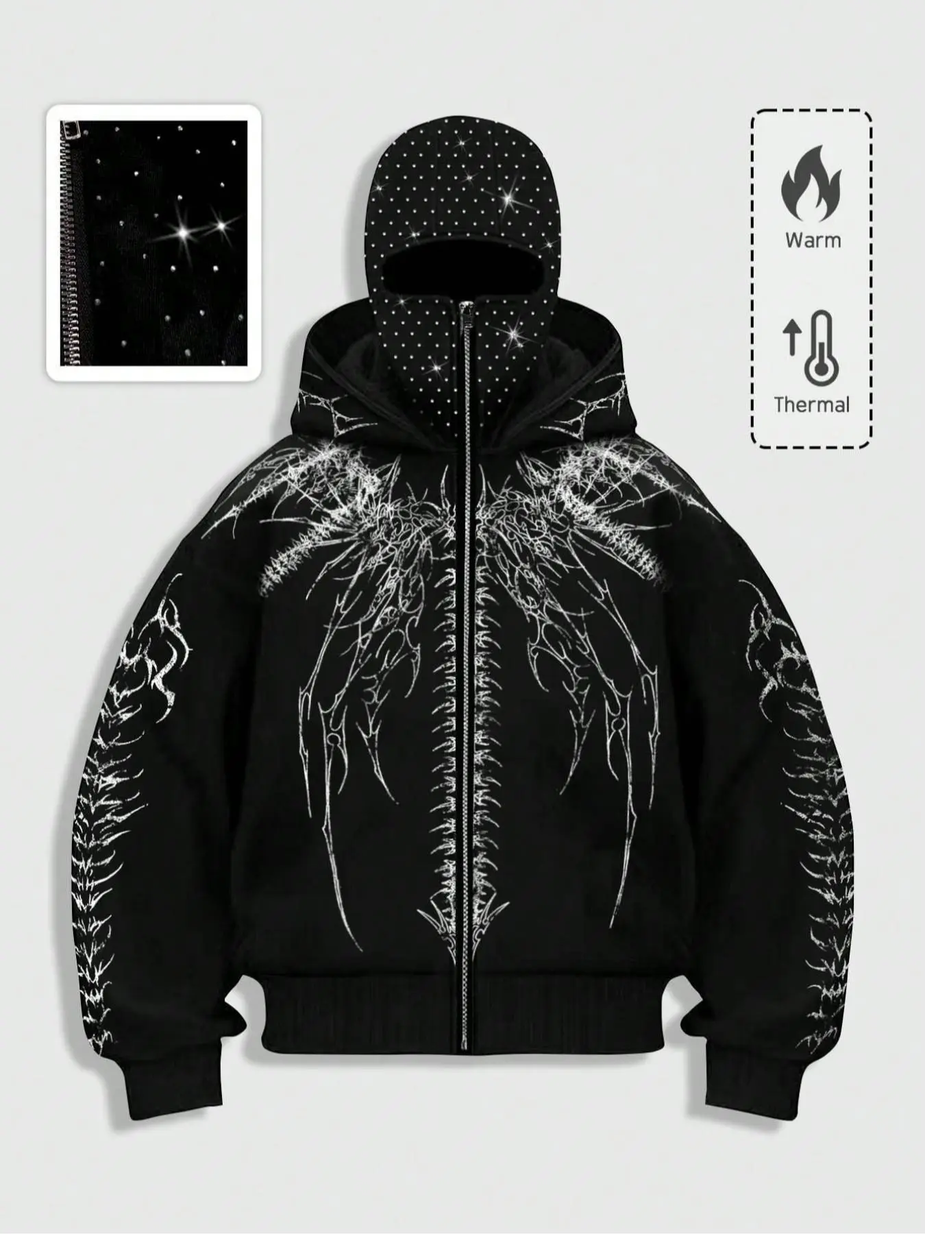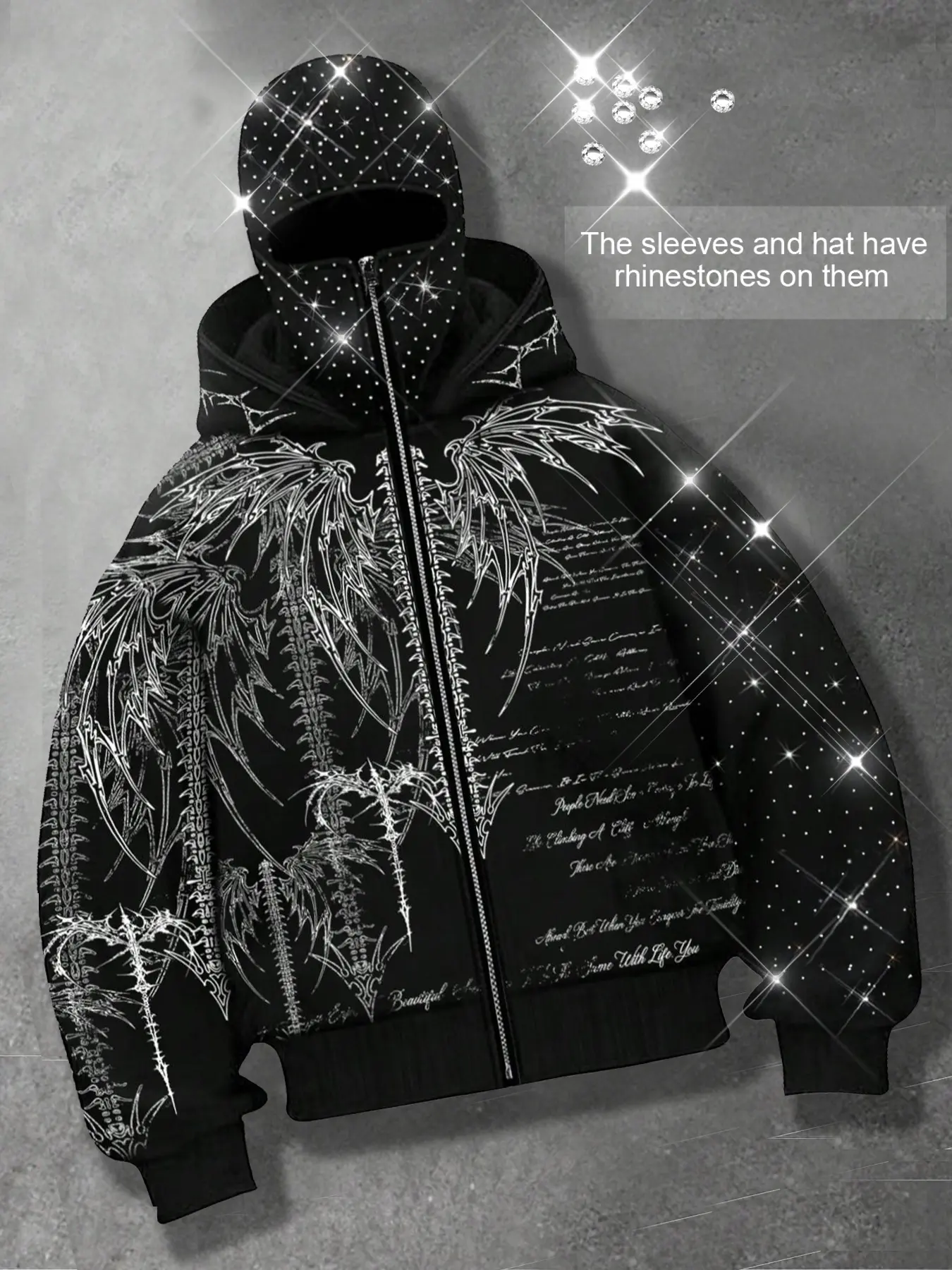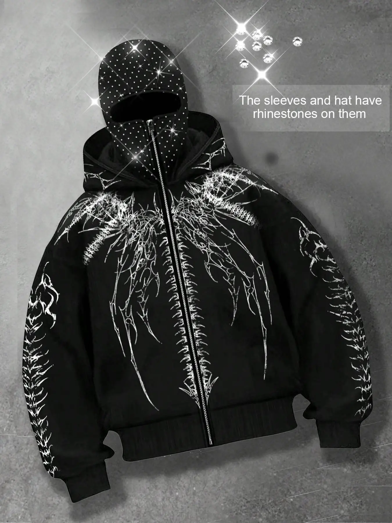 Shining rhinestones, windproof hat zipper hoodie for men, Gothic style skeleton cardigan hoodie for men and women, European and American street casual fashion brand jacket, autumn and winter velvet hoodie, party nightclub Instagram style