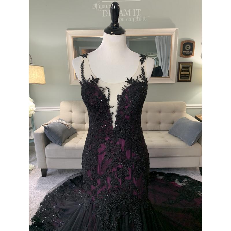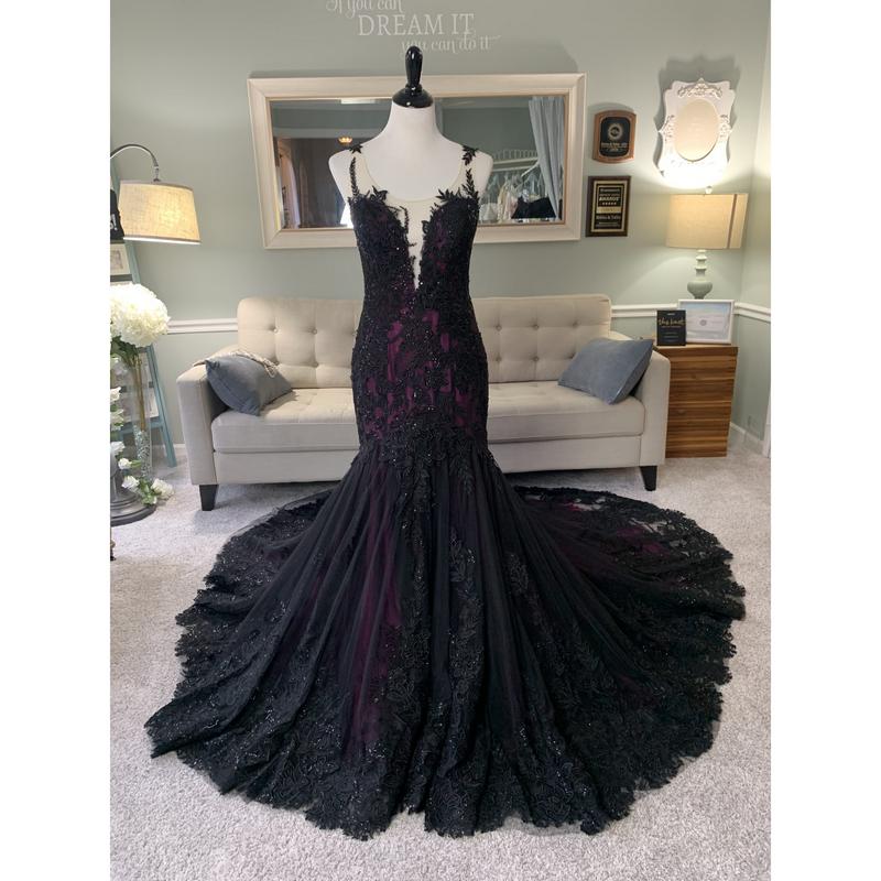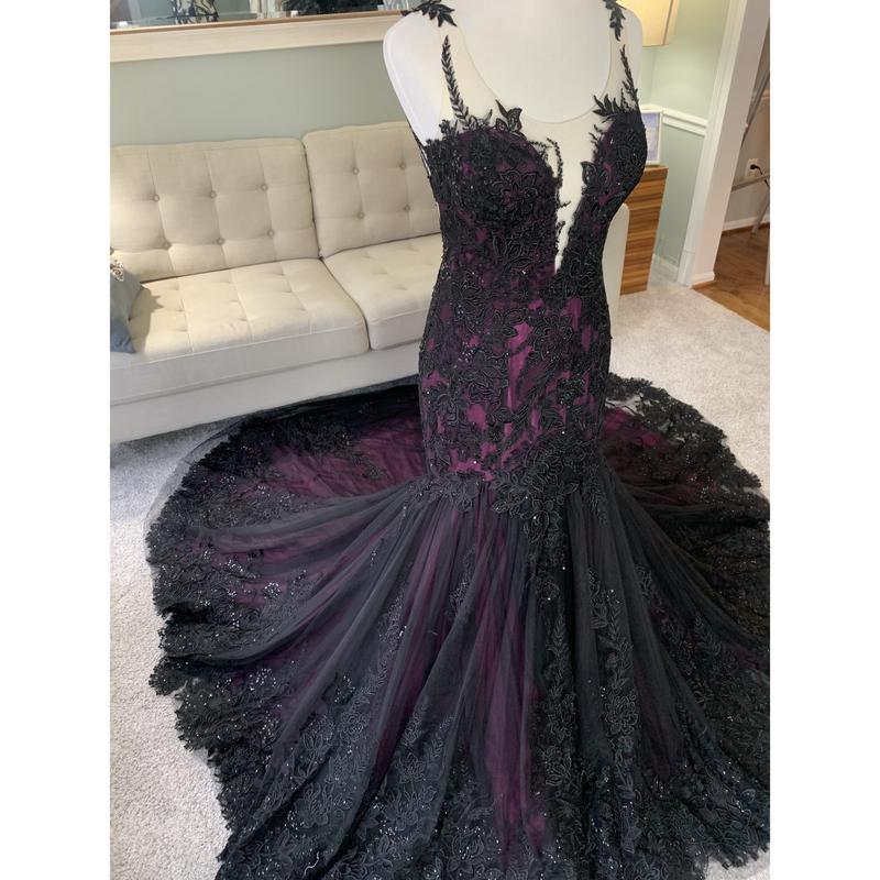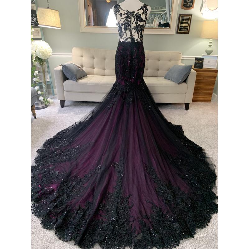 This gorgeous Black and Purple Wedding Dress  is the perfect choice for the elegant bride who wants a themed wedding with alternative colors . It features beautiful black lace with an illusion back that is a total show-stopper. The sequins on the lace add a gorgeous touch to it, and its Trumpet  Dress Style would give any bride the perfect sexy silhouette.