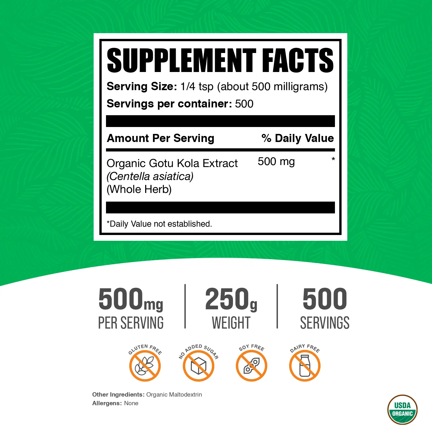 Introducing Organic Gotu Kola Extract powder by BulkSupplements! Gotu Kola contains a mix of essential vitamins including C, A, and various B vitamins, in addition to minerals such as calcium and magnesium. Set your overall health journey on a course of revitalization and strength!