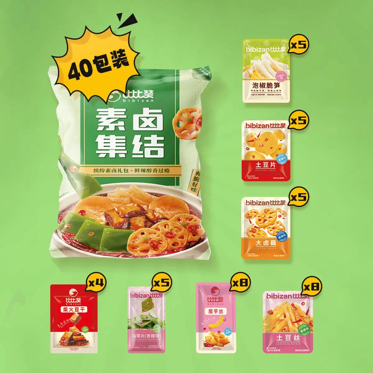 BiBiZan Gourmet Snack Gift Box 40 Packs 548g - Flavorful Braised Snacks with Potato, Lotus Root, Dried Tofu, Seaweed, Konjac Noodles & Spicy Bamboo Shoots