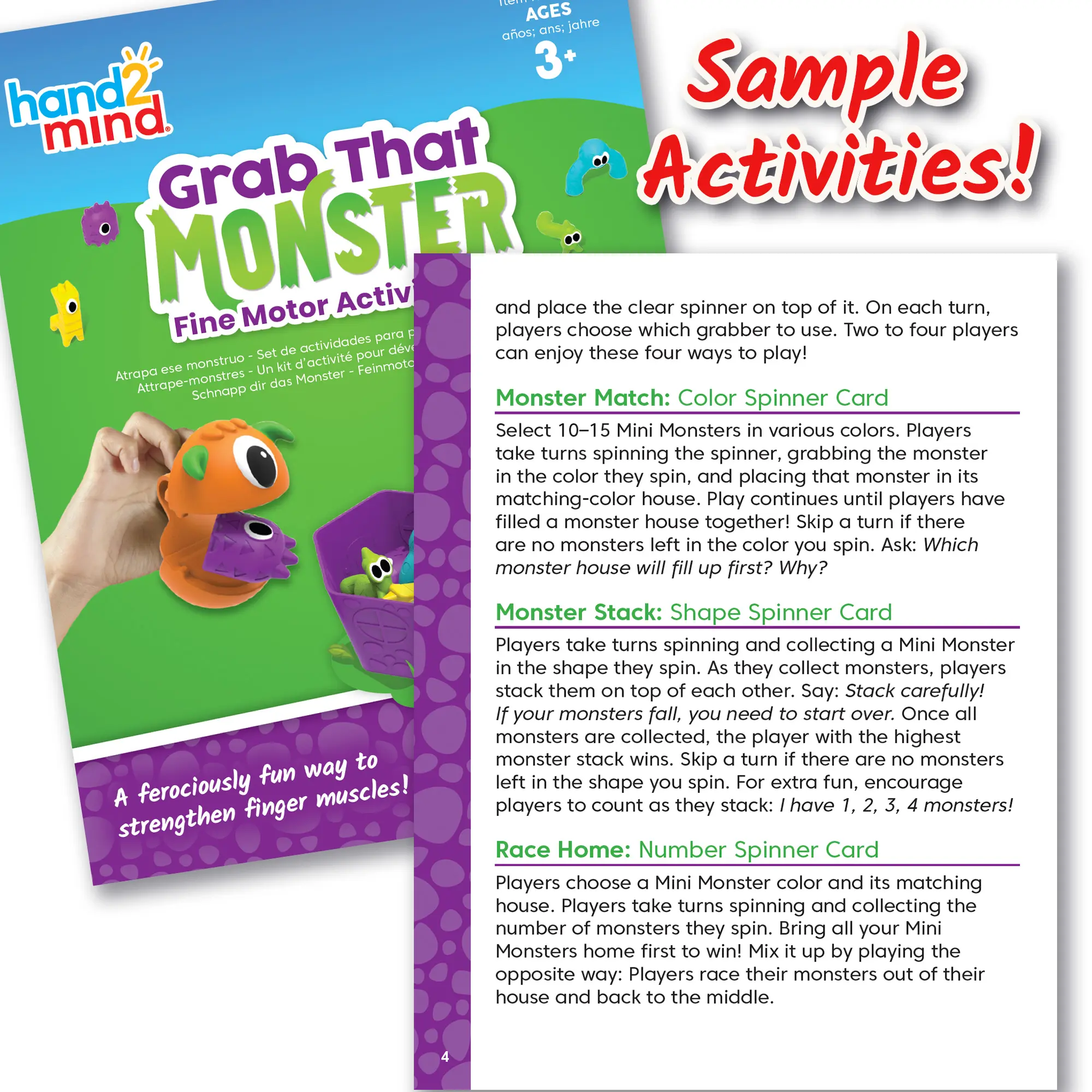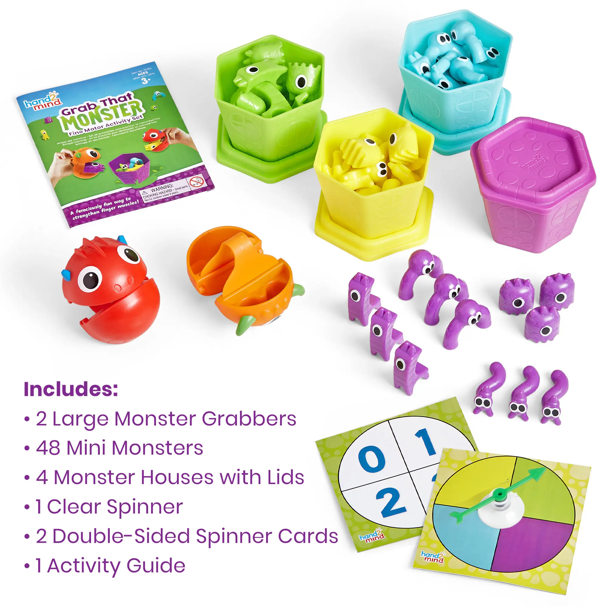 ยทPRESCHOOL LEARNING ACTIVITIES: The included Teacher-Created Activity Guide includes 4 games, or use the translucent spinner and cards to make up your own game! This set includes 2 Large Monster Grabbers, 48 Mini Monsters (12 each in 4 shapes/colors), 4 Monster Houses with Lids, 2 Double-sided Spinner cards, and 1 Clear Spinner.