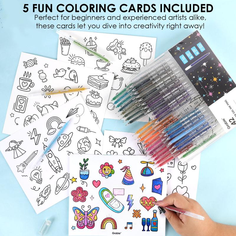These pens take gel pens to a whole new level.The gel glides on so smooth and adds the perfect amount of glittery shine to any picture or project.They come with 5 coloring sheets to try each color.I’m very satisfied and will order more. I am new to Grabie but I’m loving all the products I have.