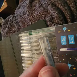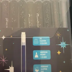 Wow 🤩 the glitter and shine is so incredible. They flow easily and I want to use them on all my art. They flow easily package did arrive with some damage but didn’t impact the pens at all. The picture shows the glitter added to a piece of art I made.