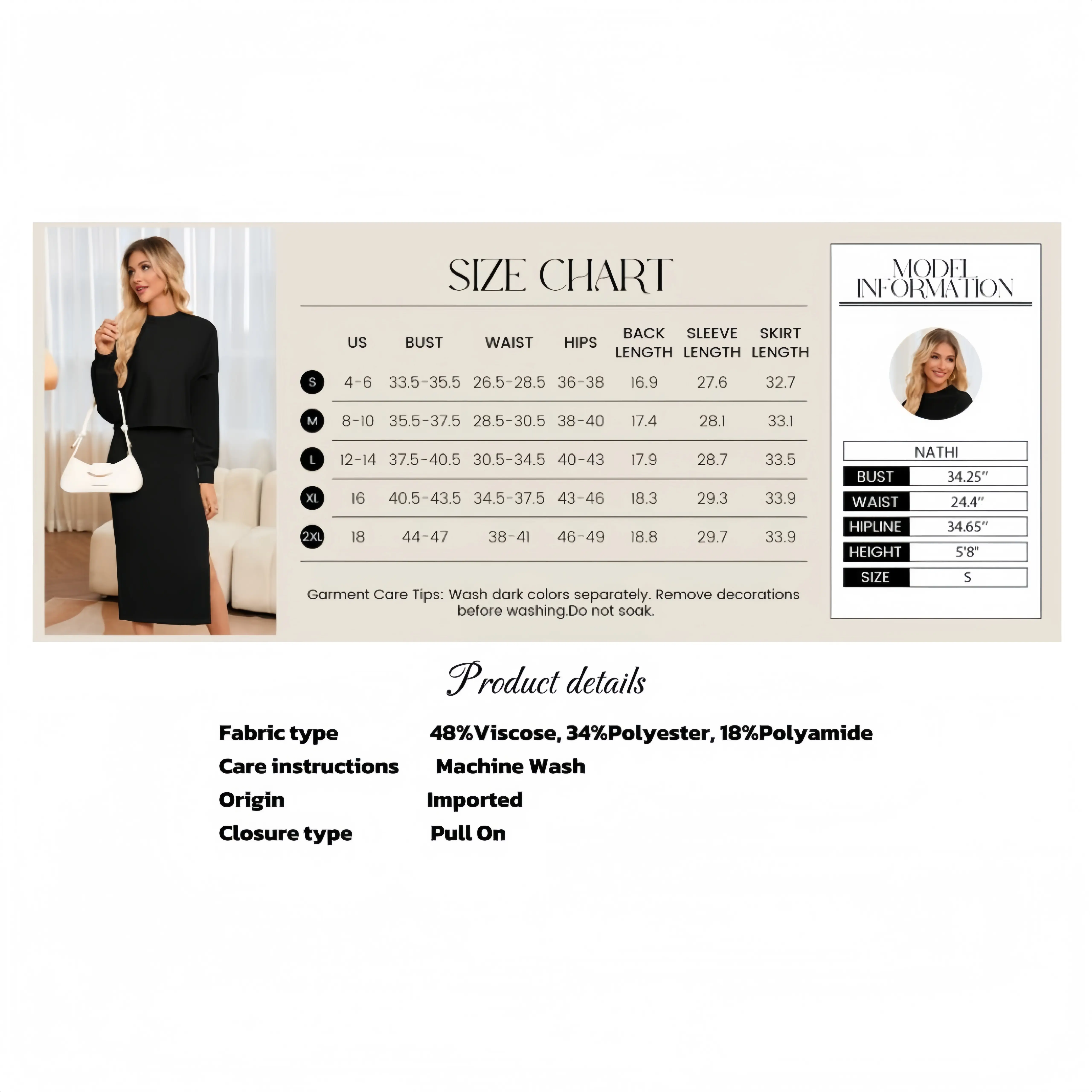 Fabric type 48%Viscose, 34%Polyester, 18%Polyamide