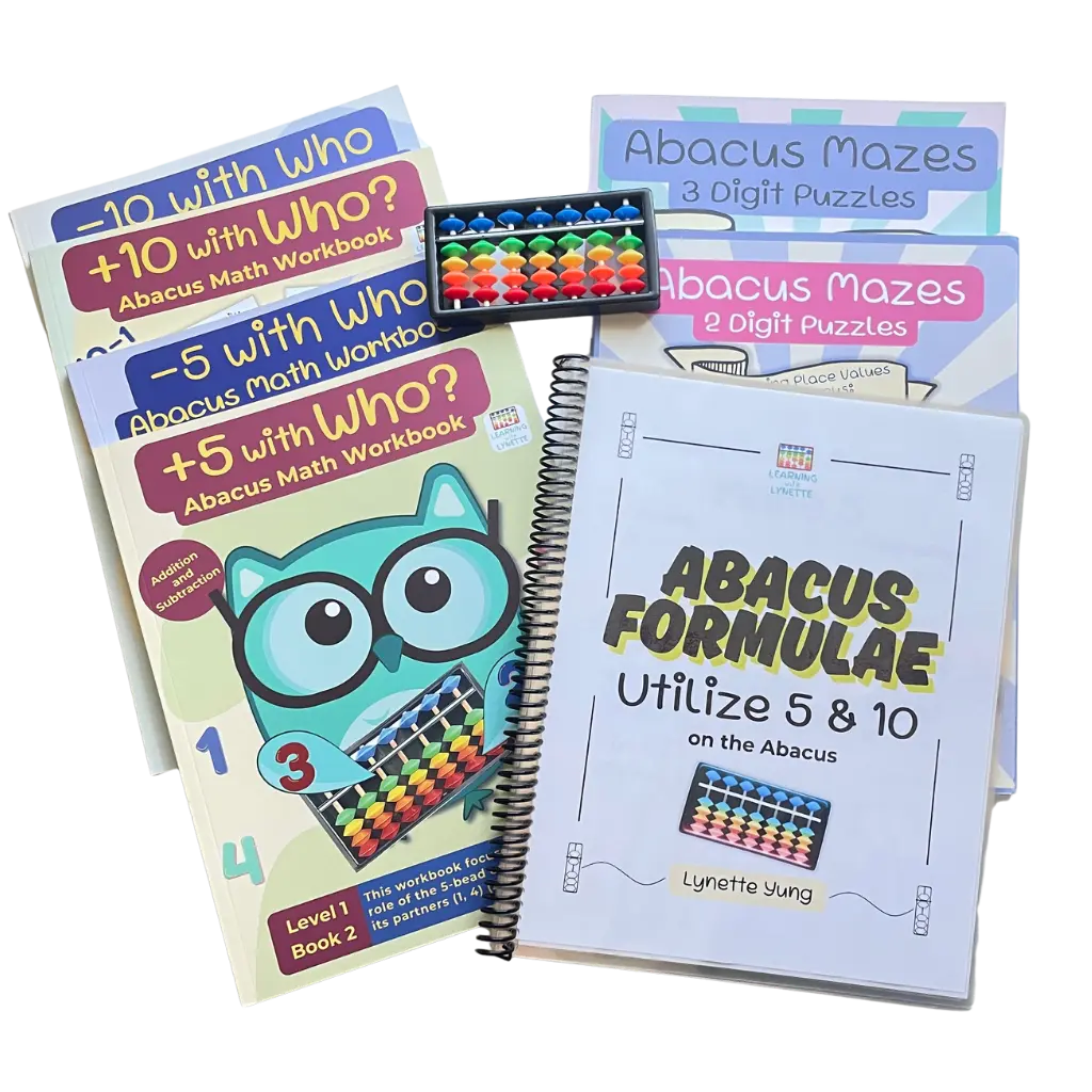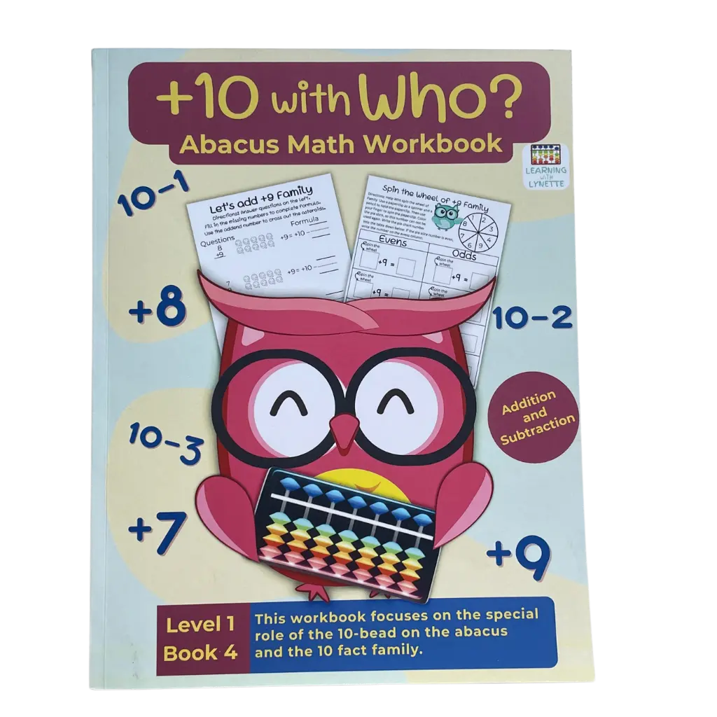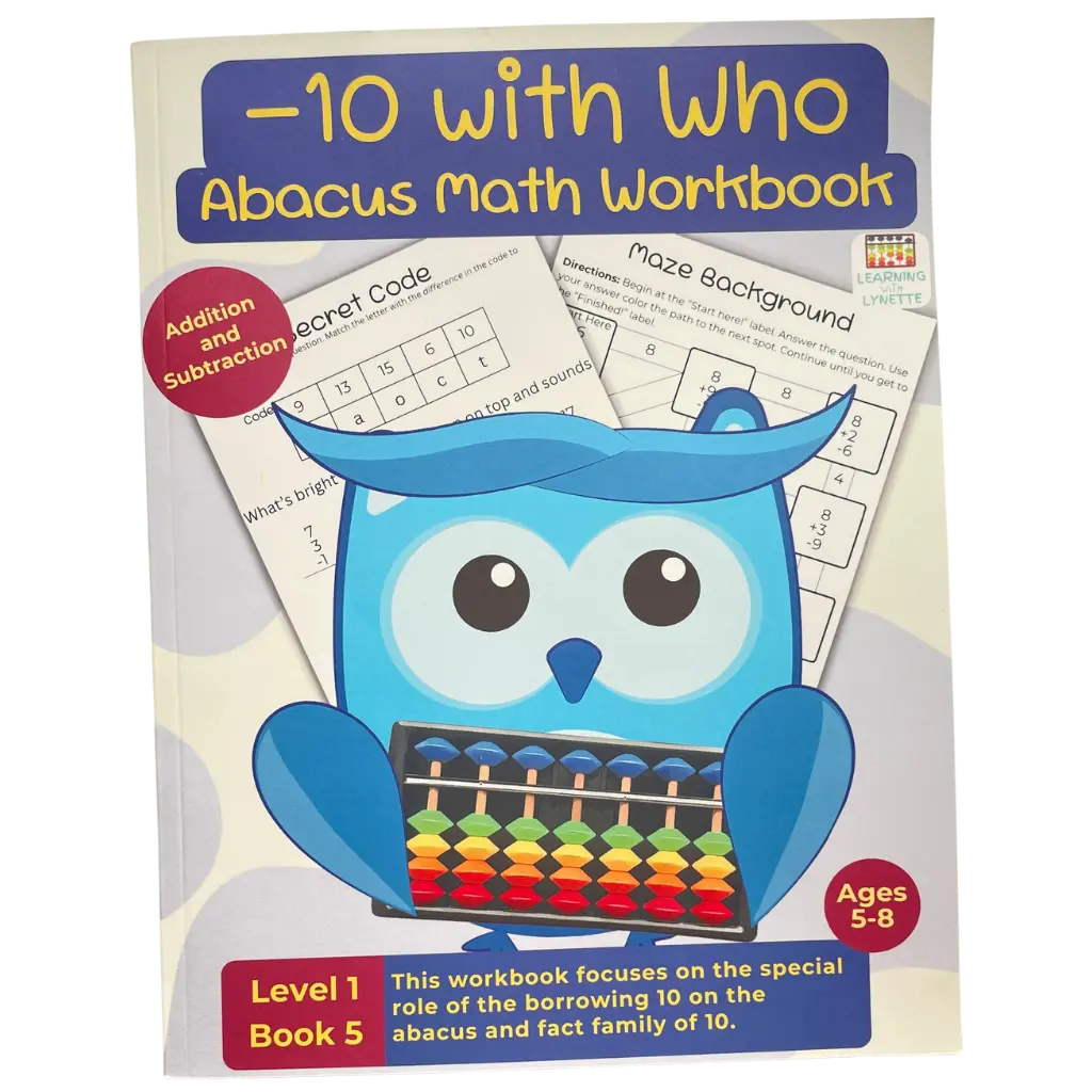 ·Book 5: -10 with Who. The "minus 10" method with abacus. Fact family for Number 10 exercises that reinforce the relationship between subtraction and addition. Game-based activities such as “Spin the Wheel,” Subtraction riddles solved through decoding answers in “Secret Code” puzzles. Real-world subtraction word problems to encourage application and comprehension. Color-by-number images and subtraction mazes for hands-on, visual learners.