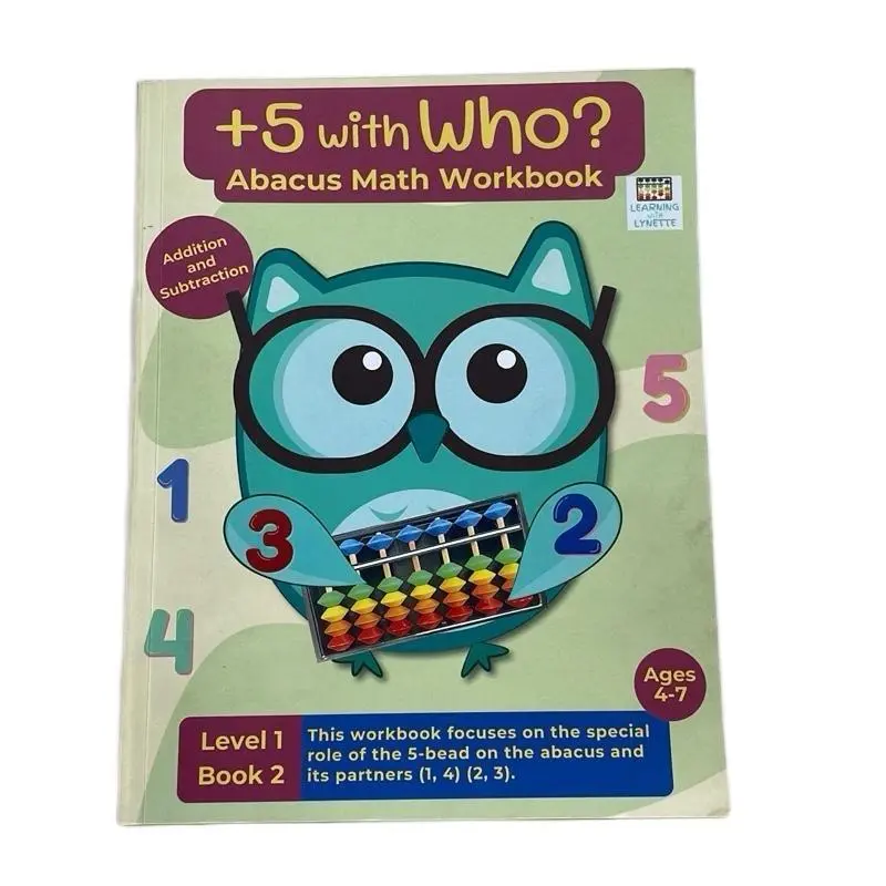 ·Book 3: -5 with Who. Continues with subtracting 5 on the abacus. Compounding knowledge of +5. Fill-in-the-blank subtraction problems. Color-by-number pages. Flower-themed puzzles and mazes. Hidden word activities. Word problems designed around subtracting 5 on the abacus