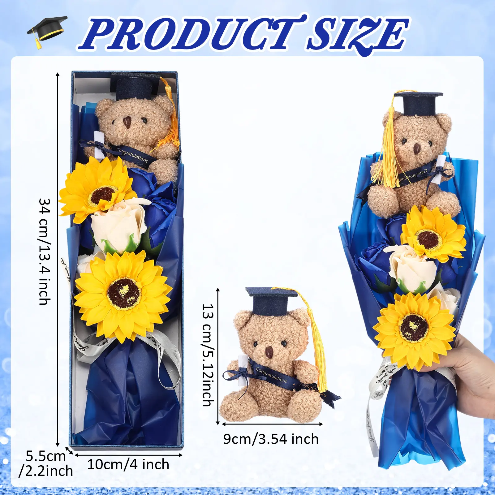·Suitable Size: the soap flower bouquet measures approximately 13.4 inches, the bear measures approximately 5.12 x 3.54 x 2.76 inches, and the gift box is about 13.4 x 3.94 x 2.17 inches; This graduation bouquet box is designed to blend into any setting, and its compact yet ample size makes it an ideal addition to a ceremony, party, or interior decoration