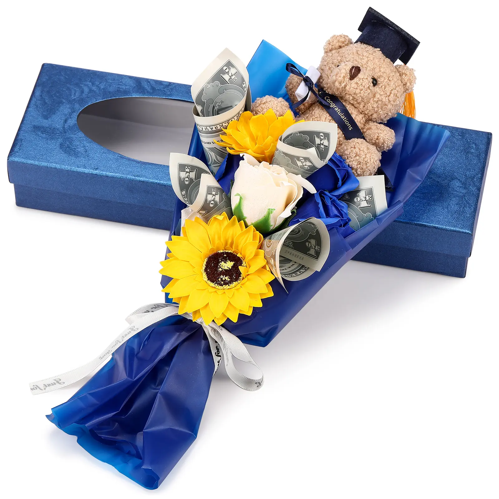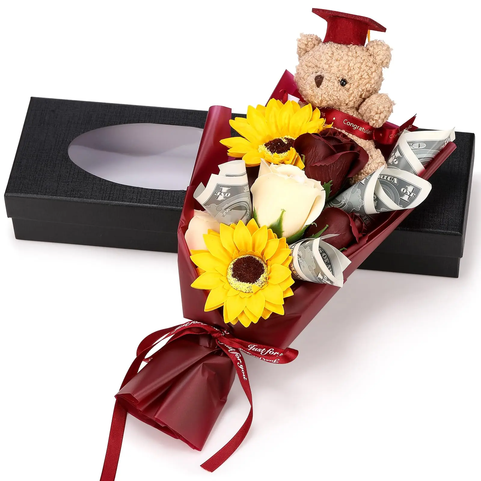 ·Package Includes: you will receive 1 graduation flower bouquet, which contains 5 handmade soap roses and 2 soap sunflowers, and comes with a graduation themed stuffed bear, and a gift box with a window, a charming memento for graduation ceremonies and other festivities
