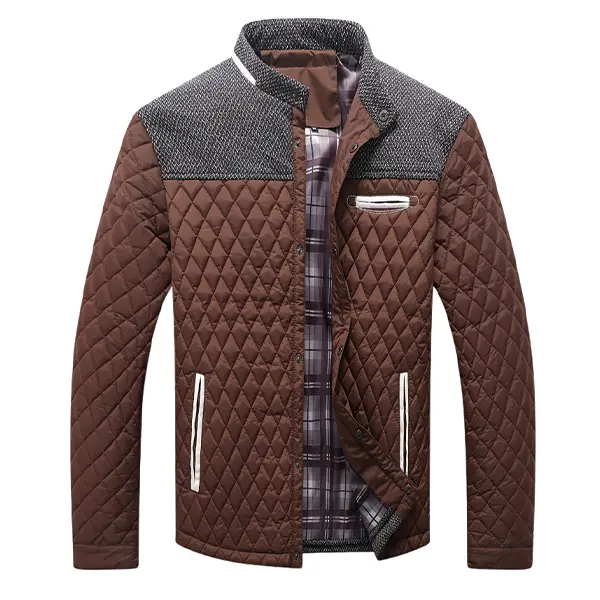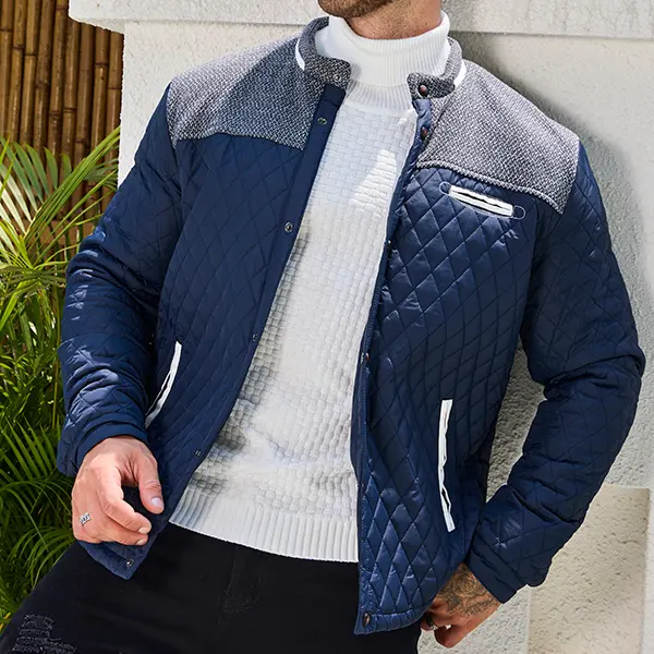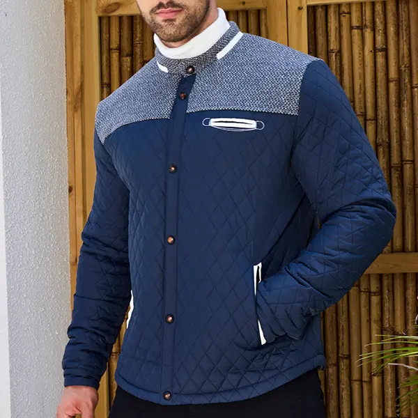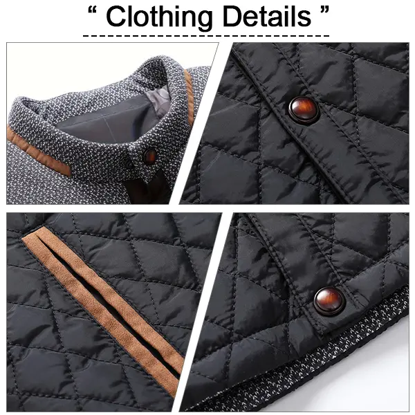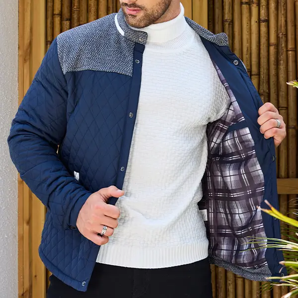 The black diamond-quilted design combined with gray knit panels creates a luxurious texture, and the high-quality leather accents will delight those who appreciate fine details. The stand collar, zipper, and buttons provide triple insulation, and the plaid lining ensures you stay warm in any temperature.
