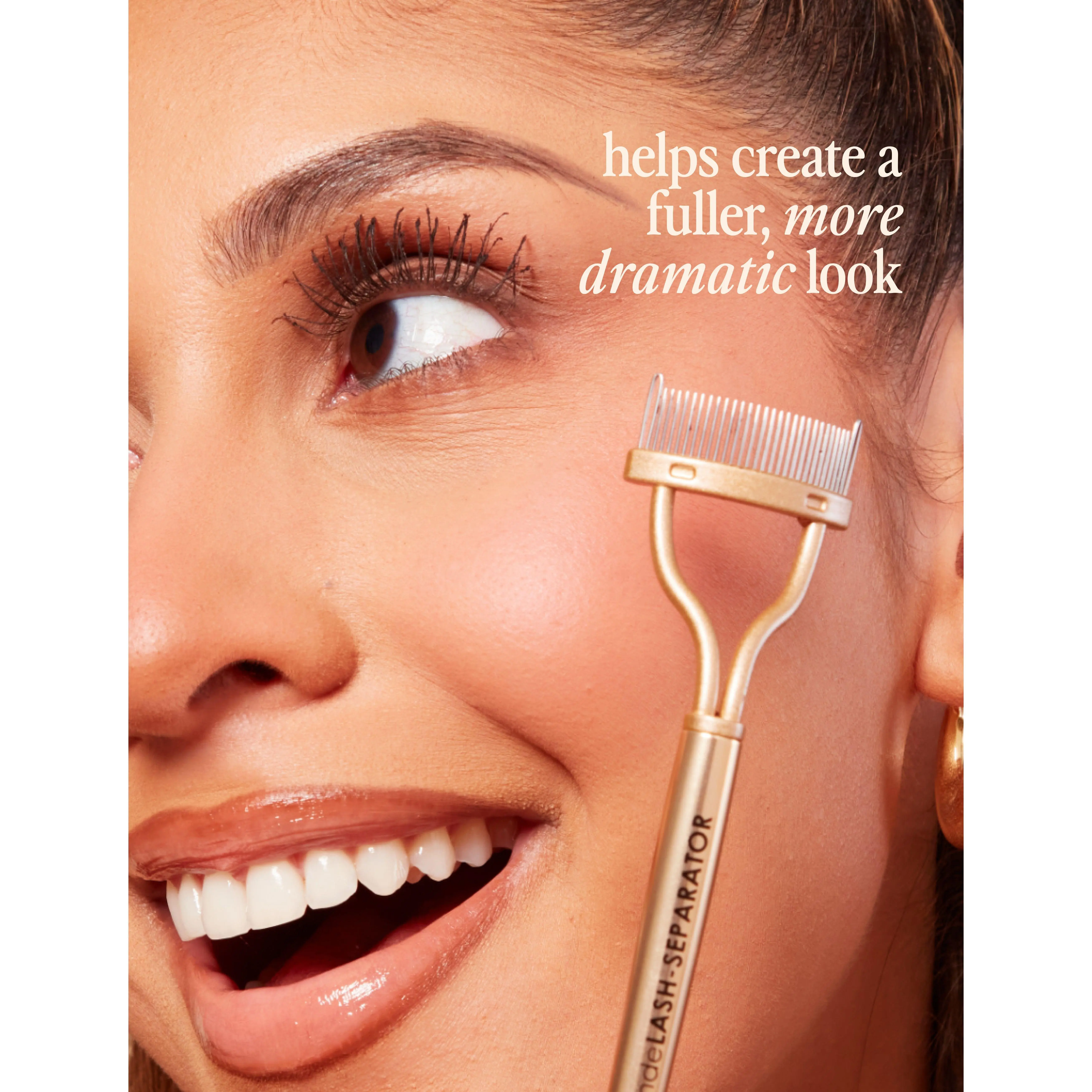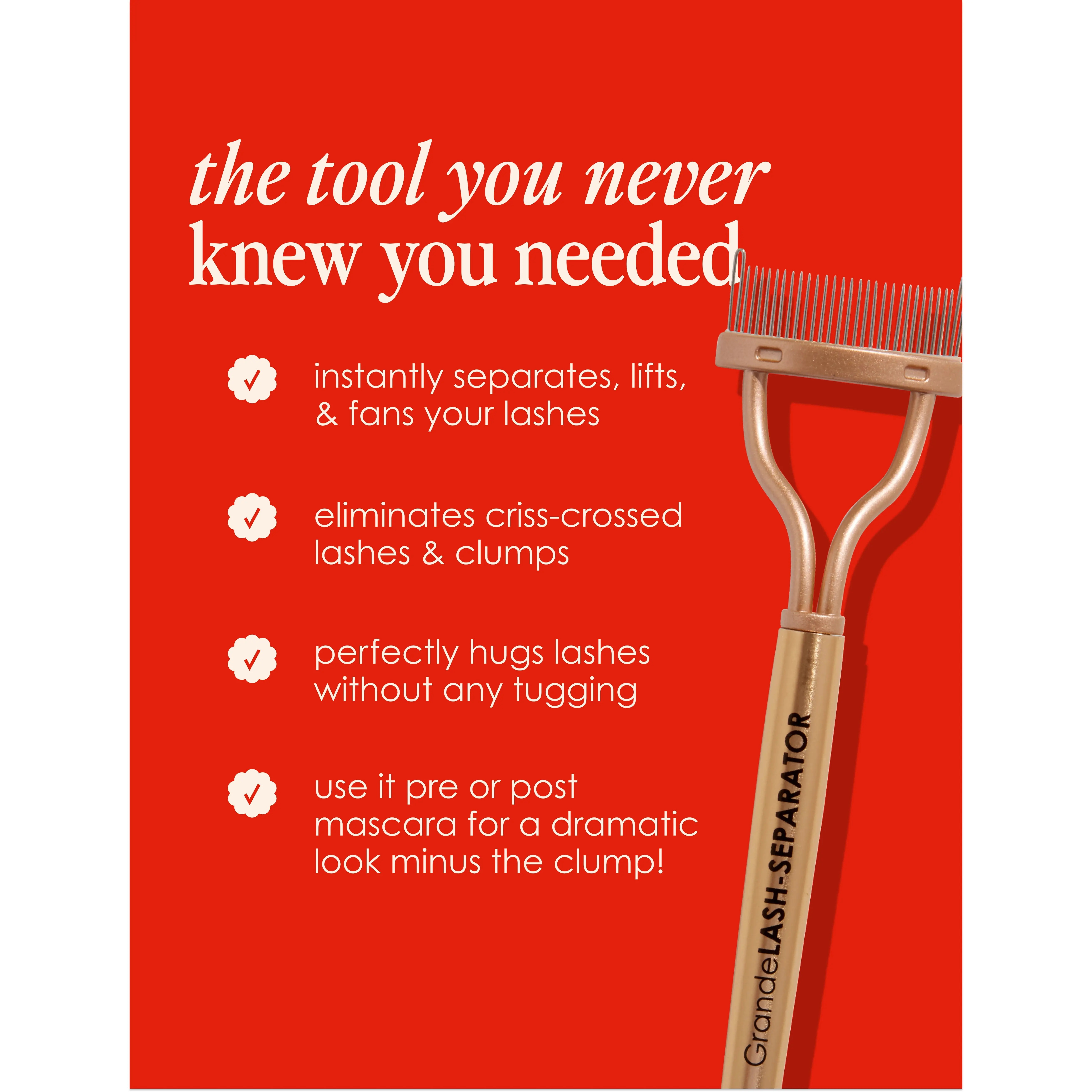 GrandeLASH-SEPARATOR is the tool you never knew you needed! Use it pre or post mascara to instantly separate, lift, & fan your lashes. The curved comb design fits perfectly to the contour of your eye to hug lashes without any tugging while the precisely spaced teeth evenly distribute mascara along lashes. The perfect tool for a fuller, dramatic look minus the clump!