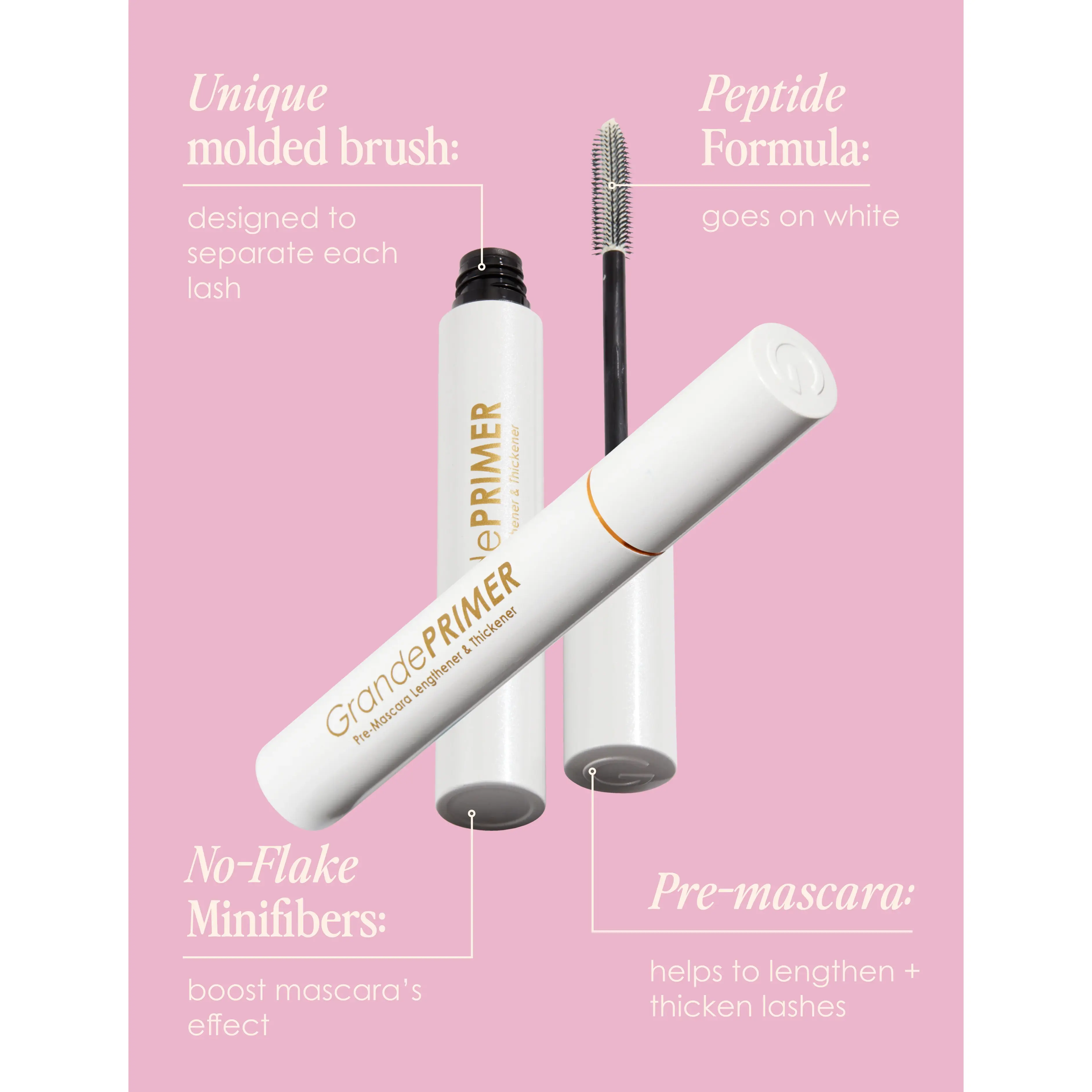 The missing step in your lash routine that you never knew you needed! Specially formulated with a blend of no-flake minifibers and peptides, GrandePRIMER coats your lashes to prepare them for mascara application and boosts its effects. Its formula is smudge proof, water resistant, and suitable for contacts. The unique molded brush is designed for lash priming to ensure proper separation of each and every lash, resulting in a flawless application every time. It truly is your mascara’s new best friend.