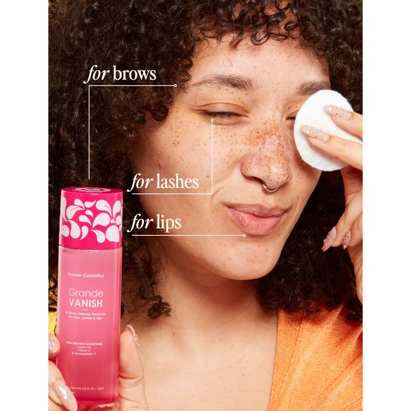 From the leaders in lash and brow, this gentle bi-phase formula not only effortlessly removes makeup, but also nourishes the delicate skin around the eyes while providing skincare benefits to the lashes and brows. Expertly formulated with a proprietary blend that features Hexapeptide-11 and Algae Extracts, plus Vitamin E and skin-loving Avocado, Kukui, and Macadamia Oils, GrandeVANISH makes long wear and waterproof makeup vanish without a trace, taking it all off without any pulling or tugging. Hydrating and non-greasy formula leaves skin feeling soothed, supple and soft.