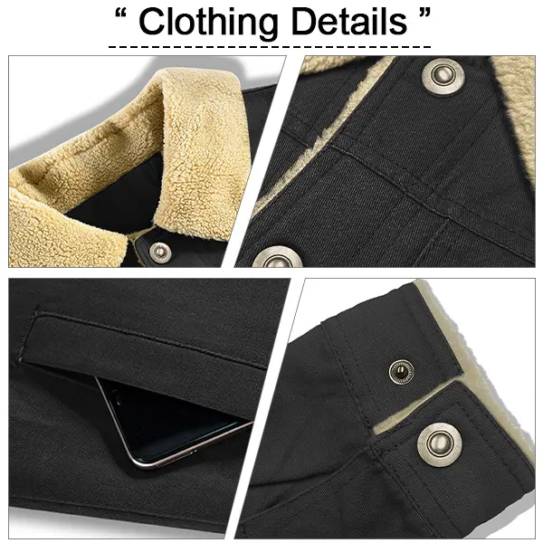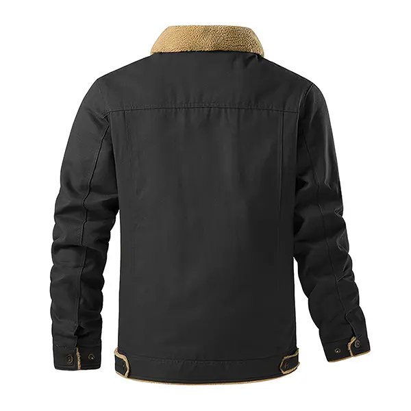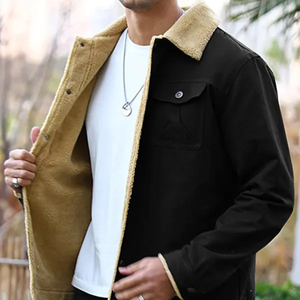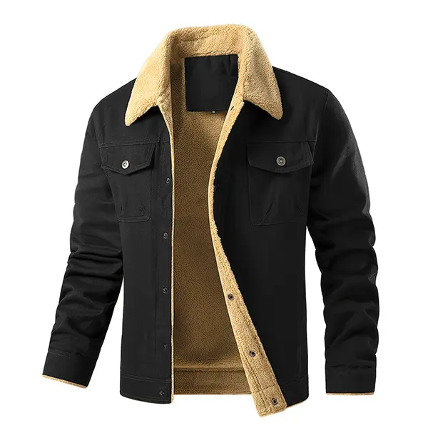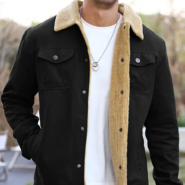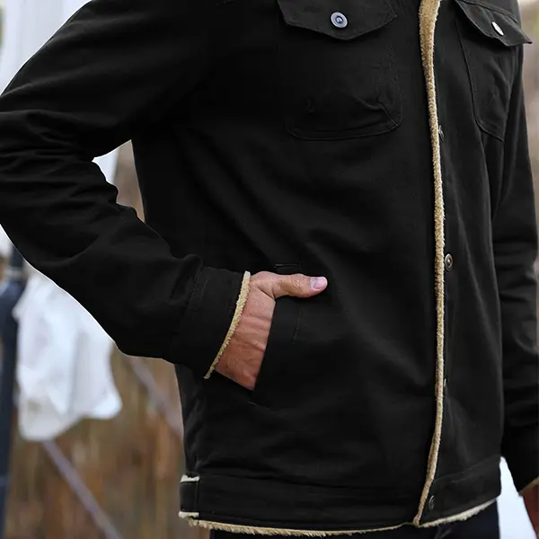 Made from durable black canvas fabric, it's tough and stylish, with soft, plush sherpa fleece lining the collar and placket, keeping you warm even in sub-zero temperatures. The classic lapel collar and chest flap pockets give it that authentic American vintage vibe.