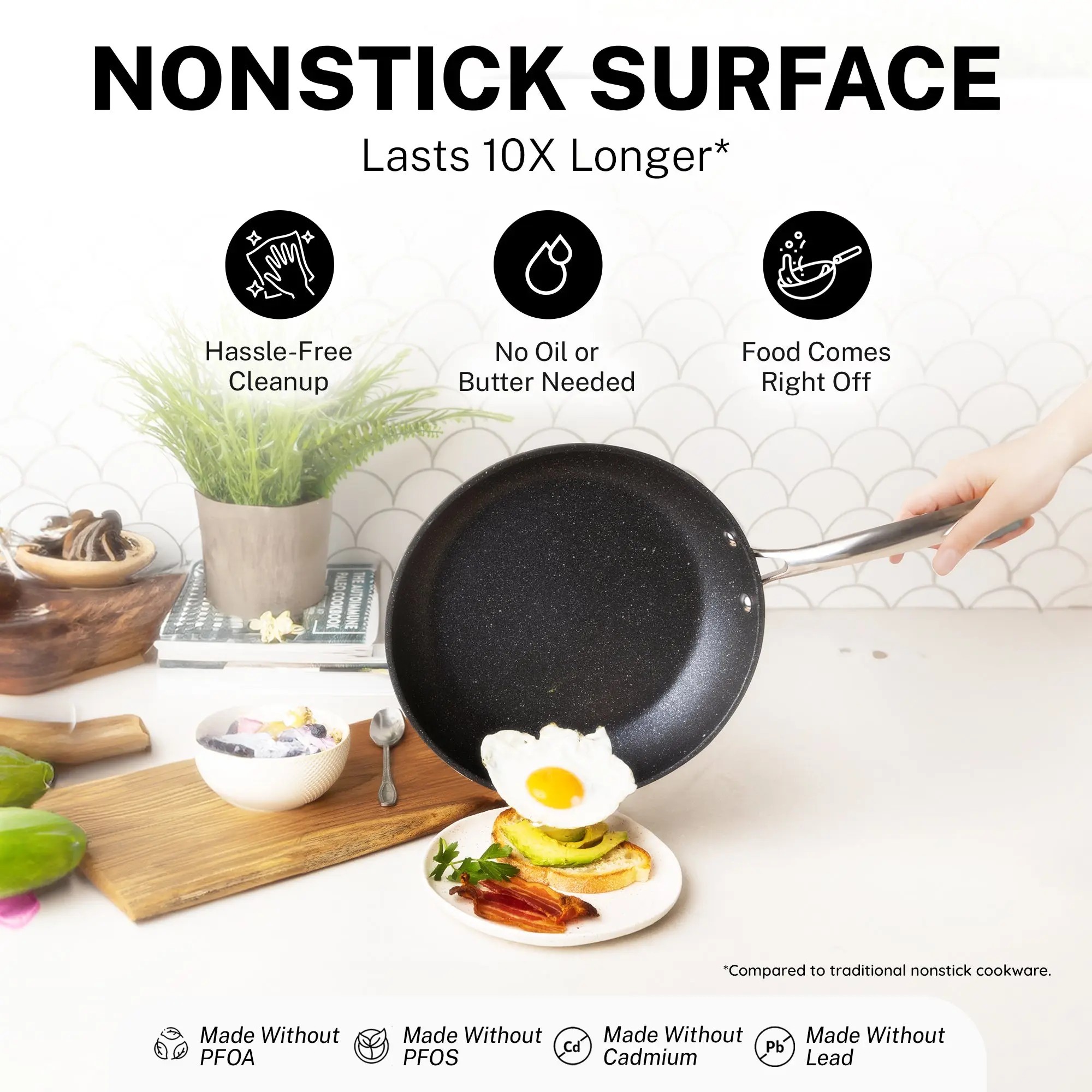 · 100% Healthy & Toxin Free: Each Piece of cookware is free of PFOA, PFOS & other harmful chemicals including lead & cadmium, allowing you to Keep a healthy, toxin free, and ecofriendly cooking environment.