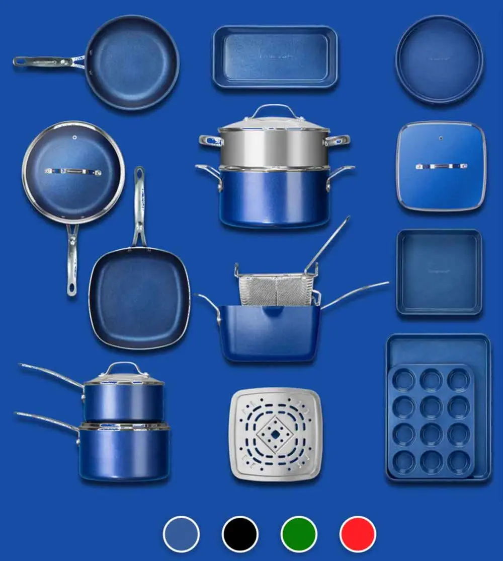 Revolutionize your kitchen with the Granitestone Kitchen In A Box, the legendary 20-piece cookware and bakeware set trusted by over 1 million customers! Available in vibrant Red, Blue, Black, and Emerald Green, this comprehensive set equips you with everything needed to cook, bake, and fry like a pro. Featuring ultra-durable, diamond-reinforced nonstick surfaces, solid aluminum construction, and dishwasher-safe convenience, the Granitestone Kitchen In A Box delivers outstanding performance and effortless cleanup. Perfect for families, new homeowners, or anyone looking to upgrade their cooking experience.