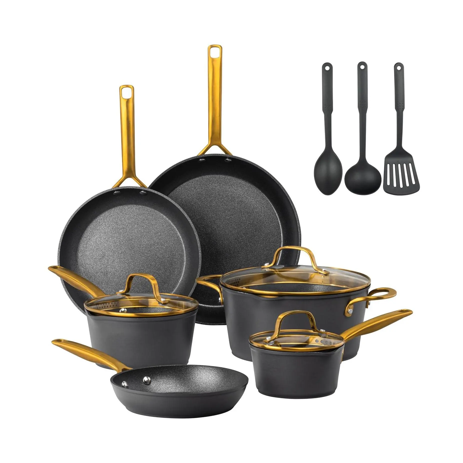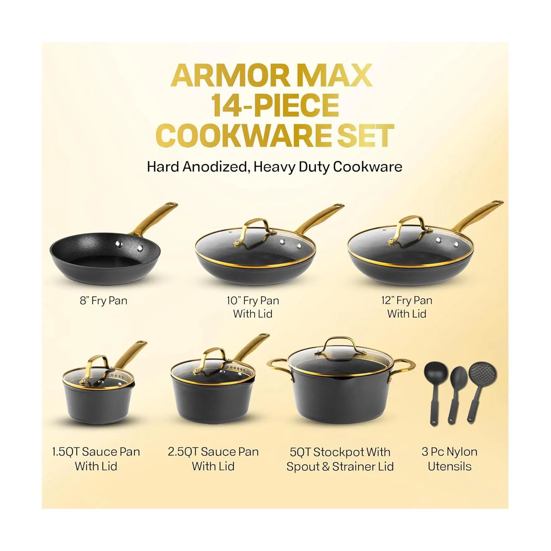 ·Includes 8" fry pan, 10" fry pan with lid, 12" fry pan with lid, 1.5 qt saucepan with lid, 2.5 qt saucepan with lid, 5 qt stock pot with lid, 3 pc nylon utensils