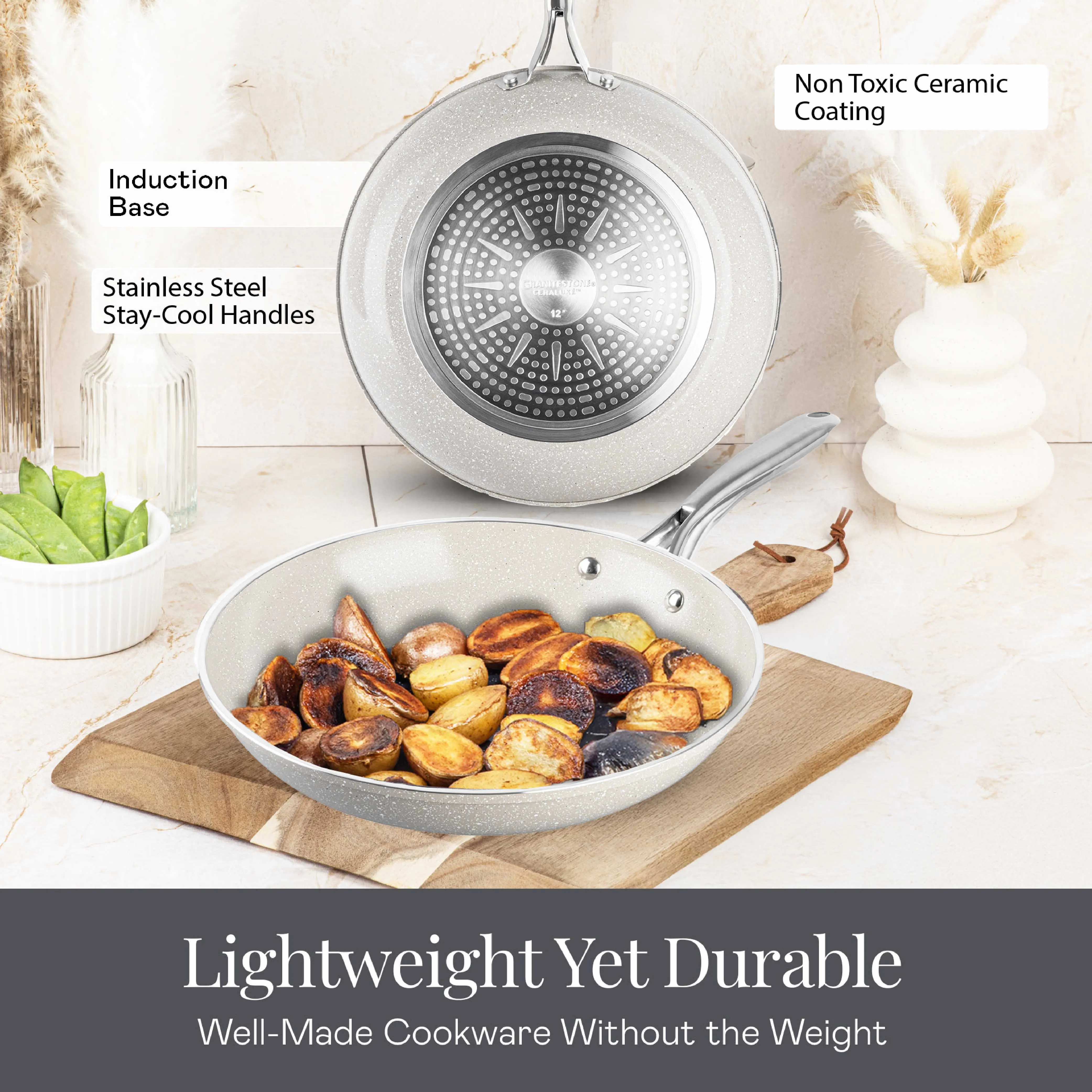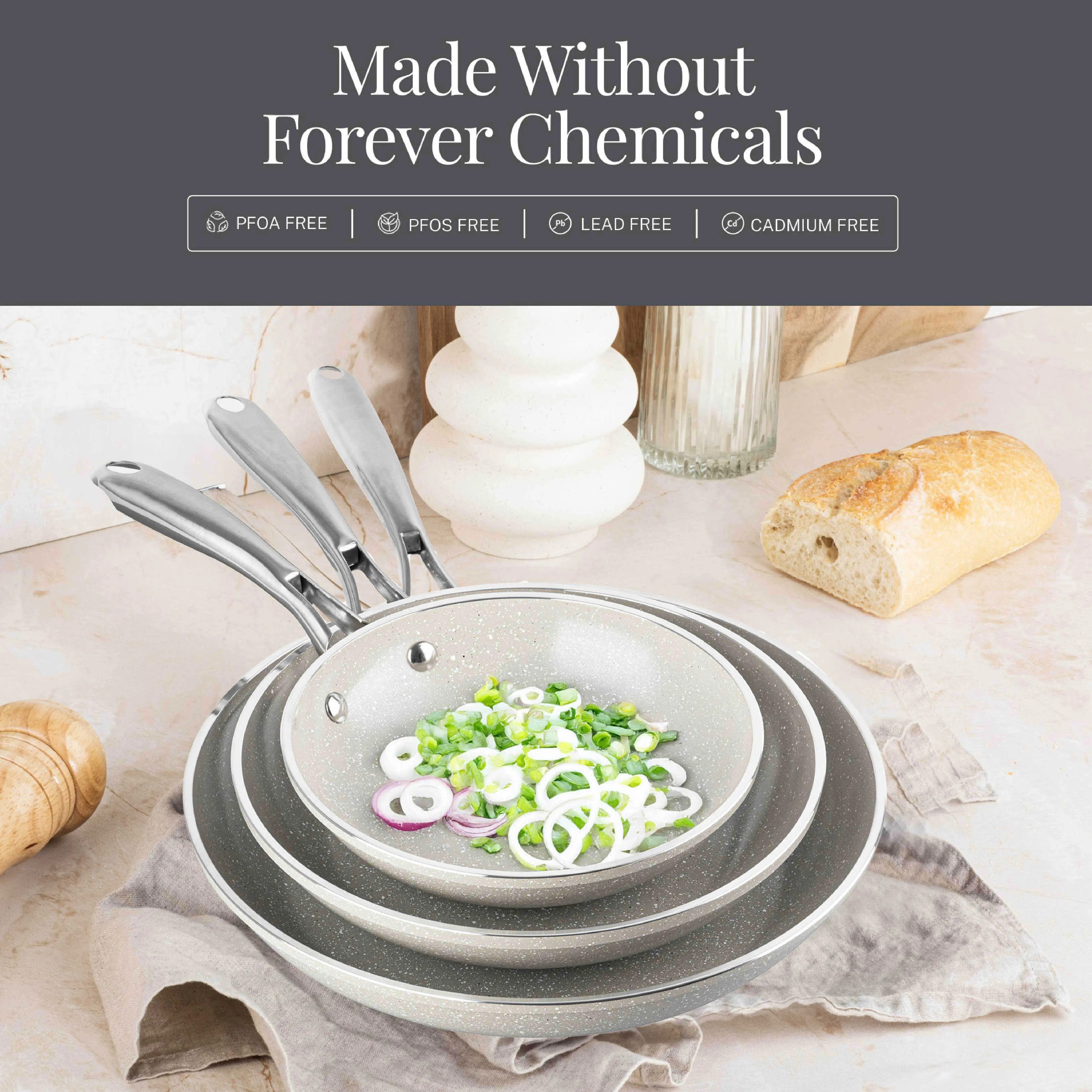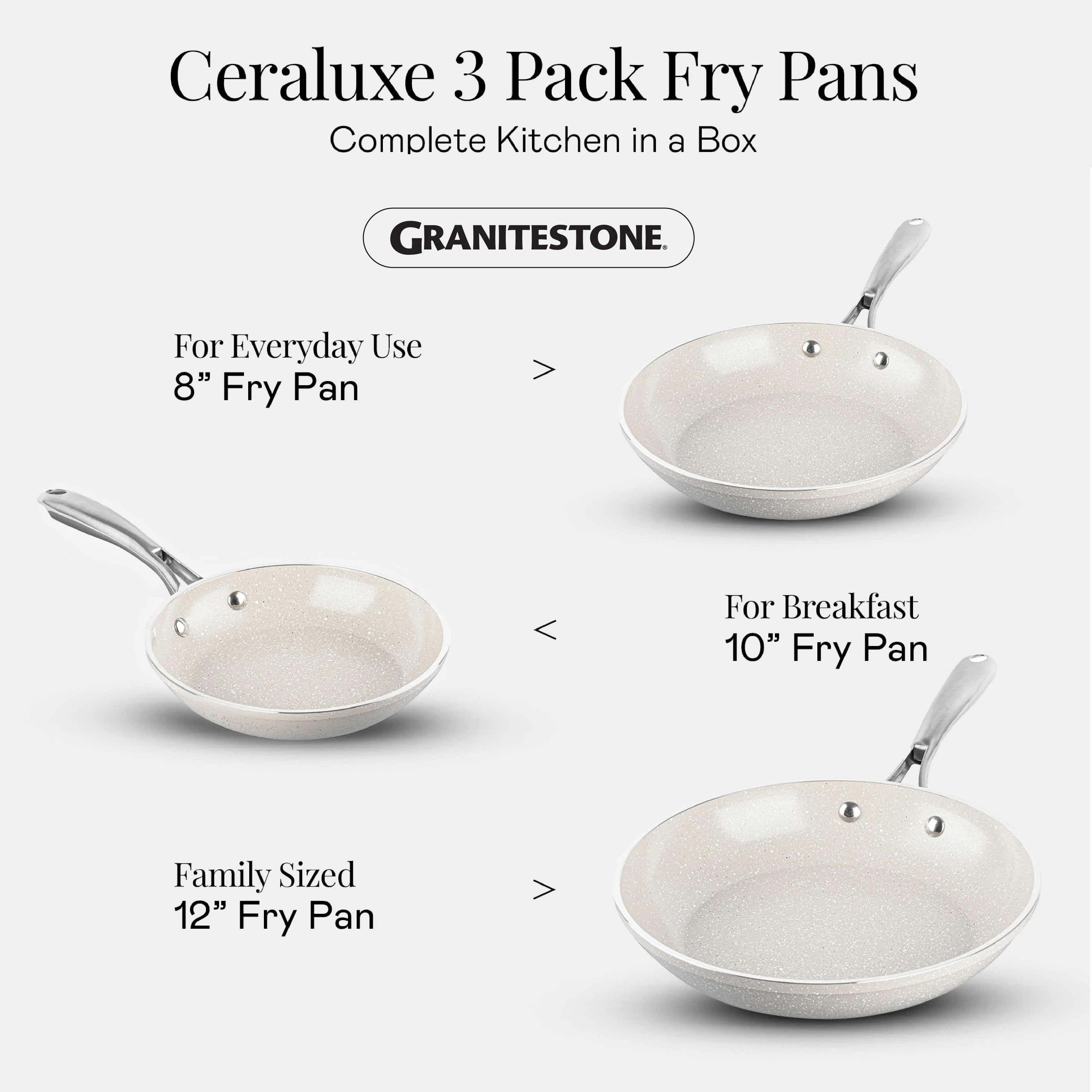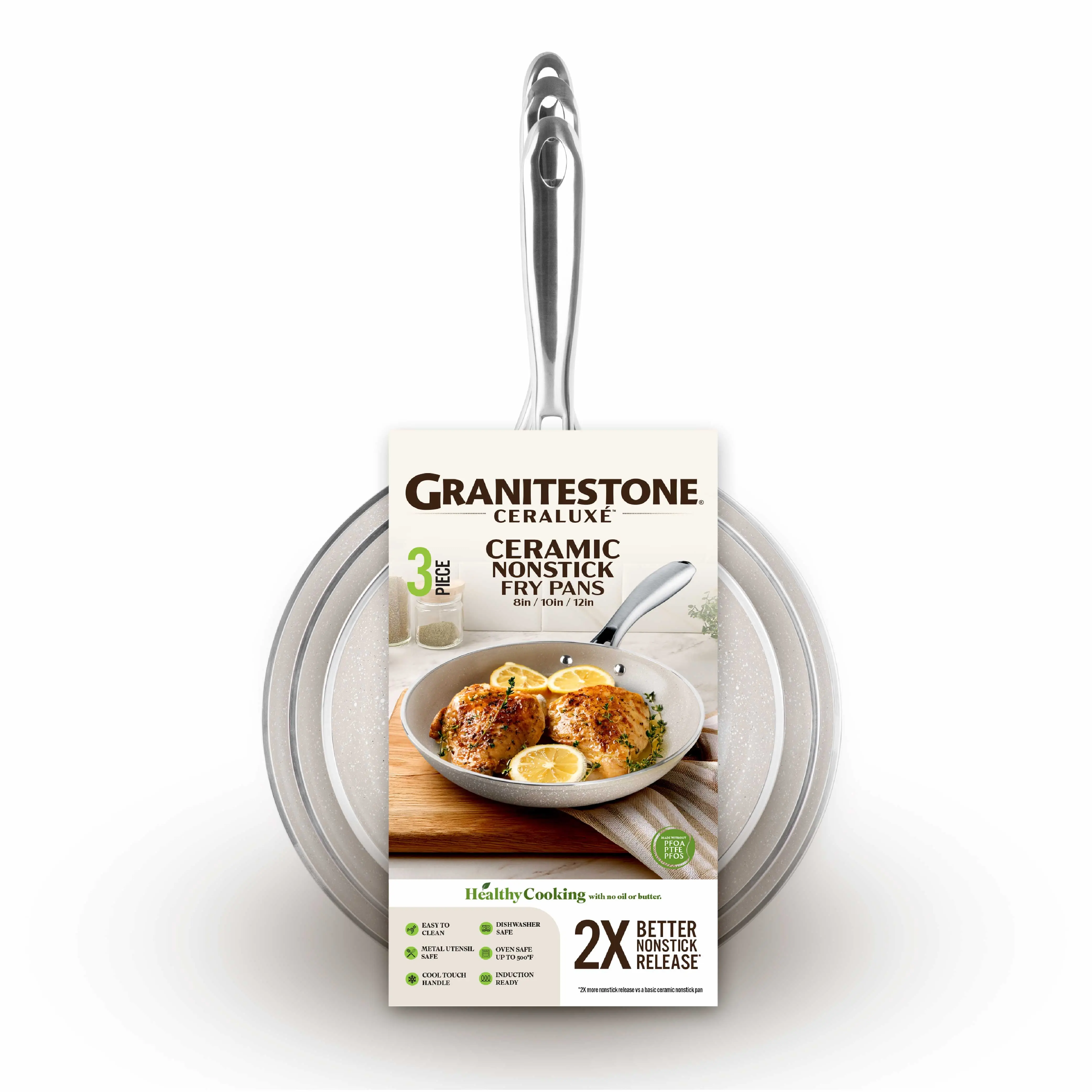 Cook smarter, safer, and smoother with the Granitestone Ceraluxe 3 Piece Skillet Set. Designed for everyday performance, this 3-piece frying pan set delivers effortless food release, even heat distribution, and modern durability, all while being 100% free from harmful chemicals. Whether you're frying eggs, sautéing veggies, or searing meats, each pan provides reliable nonstick performance and a sleek, stoneware-inspired look that elevates any kitchen.
