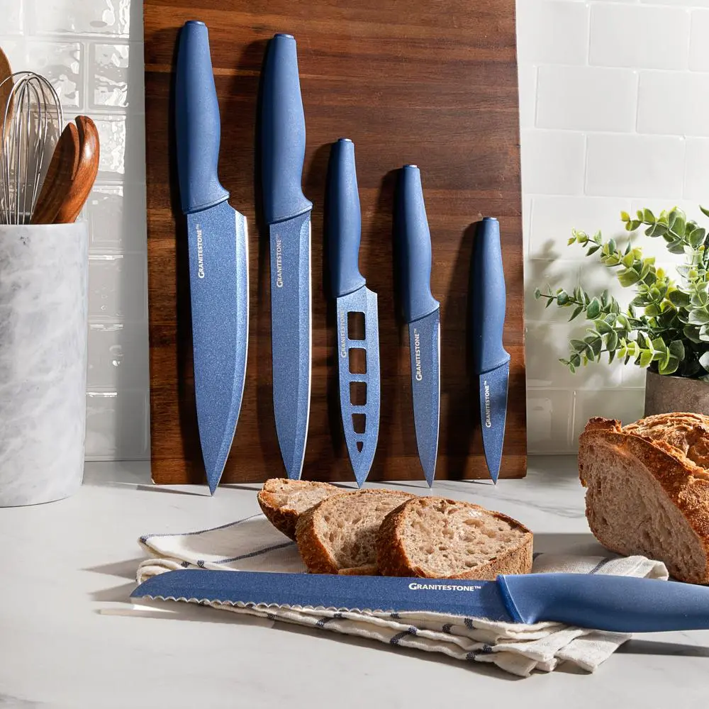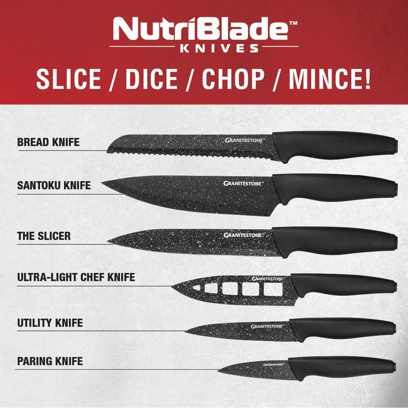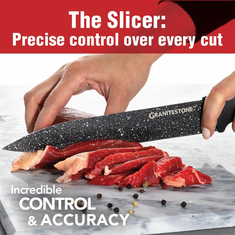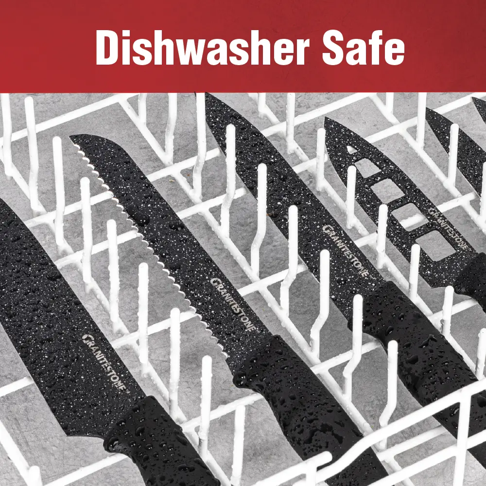 ·Ultra Sharp: Tempered, stainless steel blades are ultra sharp, cutting through kitchen work faster and easier; coated with ceramic non-stick Granitestone finish to make clean up a breeze. Caution: Super sharp blades. Handle with care.
