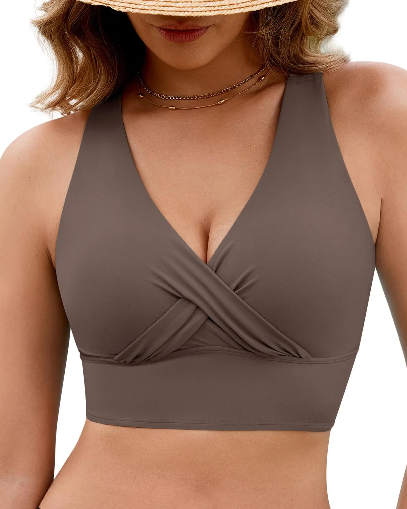 5. GRAPENT Bikini Top for Women Cropped Tankini Tops Beach Vacation Criss Cross Ruched Padded Bathing Suit Swim Top Only