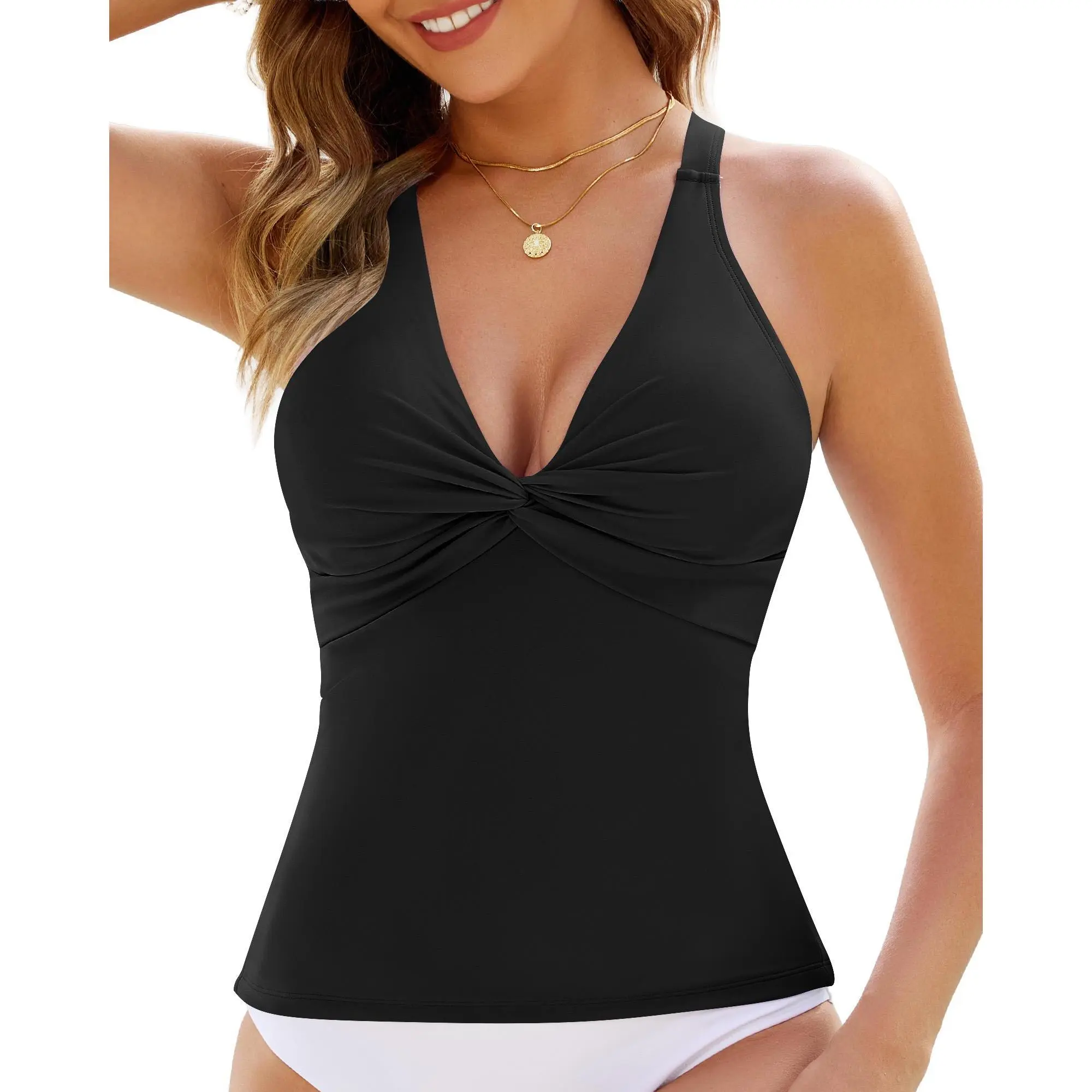 5. GRAPENT Tankini Tops for Women Swimwear Twisted V Neck Bathing Suit Beach Vacation Modest Padded Swimsuit Swim Top Only
