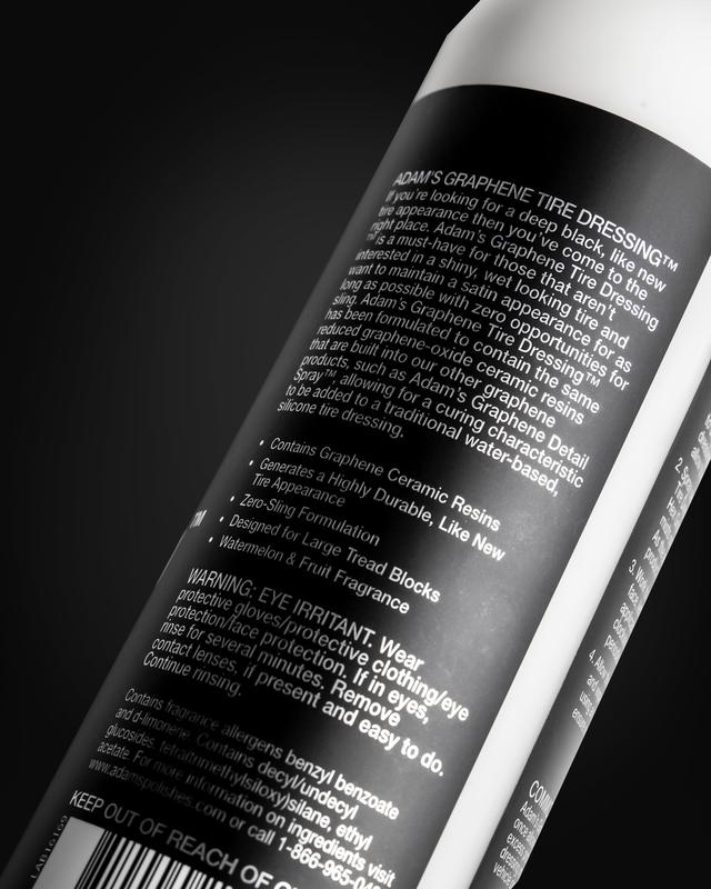Graphene Tire Dressing™ is designed for use on washed, decontaminated and fully dried tires that are cool to the touch. Graphene Tire Dressing™ is a simple, user-friendly dressing that gives tires or door seals a satin finish without the worry of run-off, sling, or fading when properly applied. This sprayable formula can be used on large off-road tread blocks, standard tread blocks, and even low-profile tread block tires.