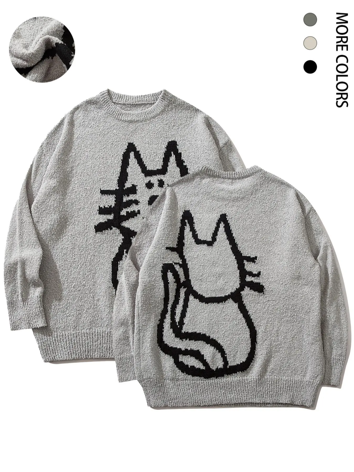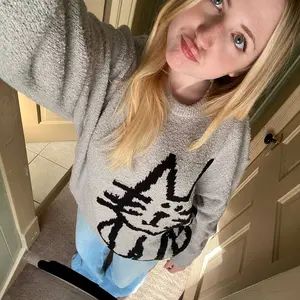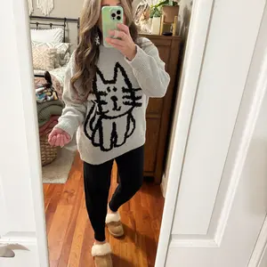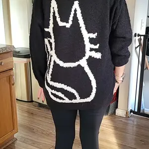 Got this cat sweater for my 18 year old daughter who love cats! Got her a size small. She is small and petite so it looks a lil over size on her and she likes it that way. It’s comfortable, warm & good quality for the price! It’s also thick enough. Not too thin.