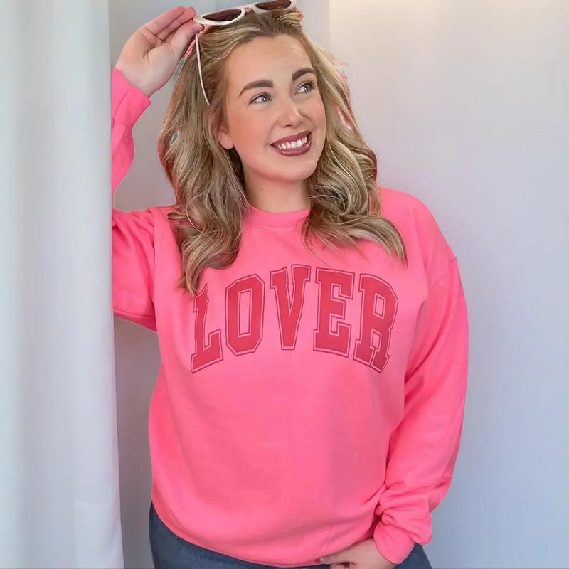 This graphic sweatshirt features the word “LOVER” printed across the front in a collegiate block font, giving it a sporty yet romantic vibe. The clean, bold lettering stands out against the soft pink base, making it an easy statement piece for Valentine’s Day and beyond.