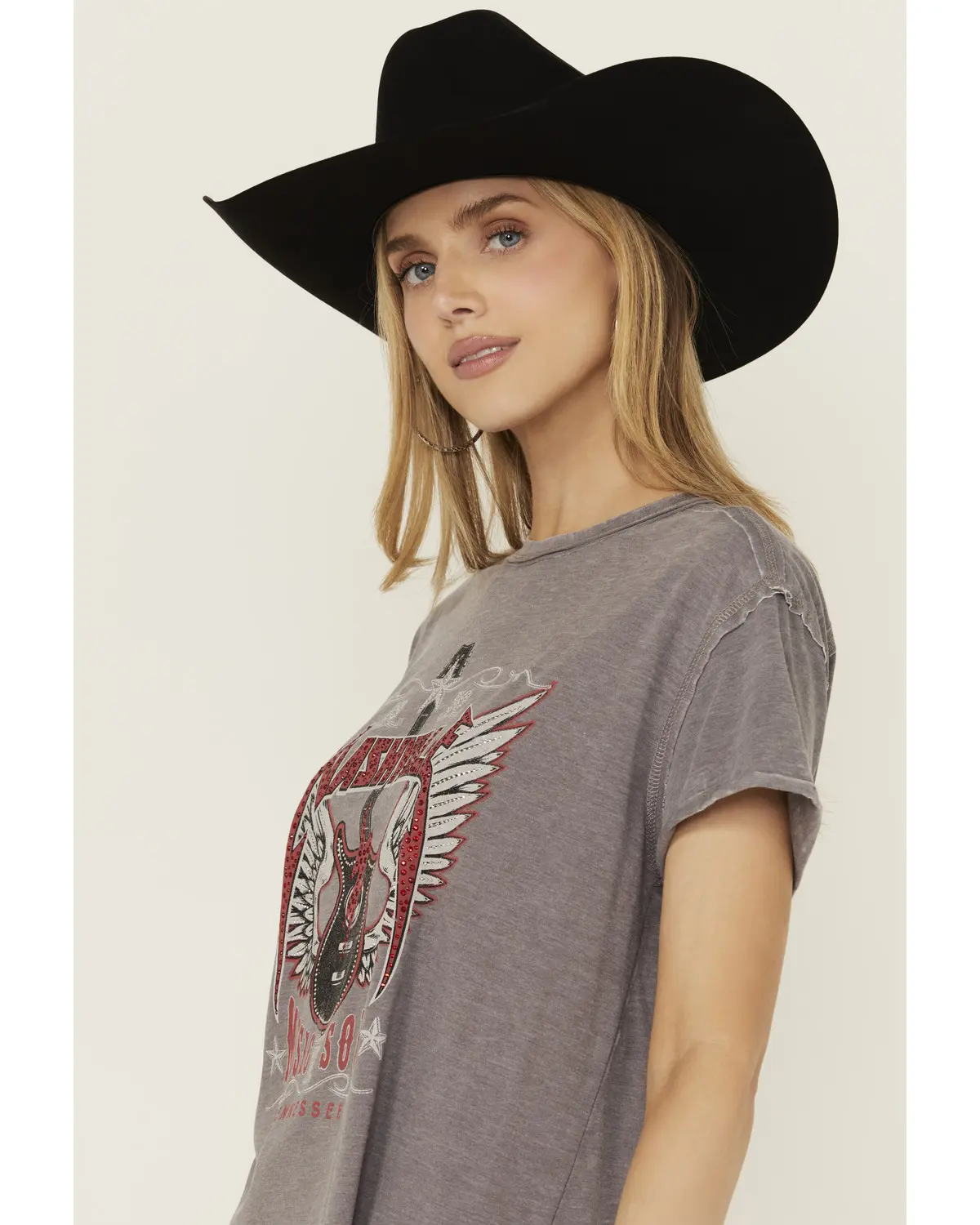 Model is 5'10" wearing a size small. 55% cotton / 45% polyester. Rib knit crew neck. Short sleeves. Heather gray design. Winged guitar graphic on front with "Nashville / Music from the Soul". Tagless neck label. Machine wash cold, tumble dry low. Imported. Red and silver-toned rhinestone accents on front.