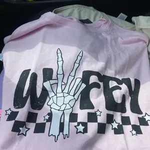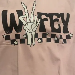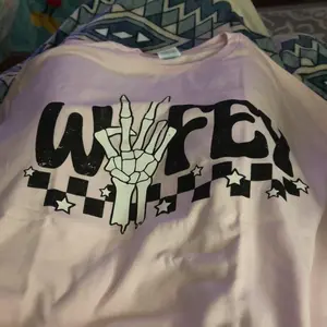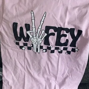 "Spread peace and love in style with our Peace Checker Wifey Graphic Tee. Featuring a bold "Wifey" text with a playful checkerboard design, this tee is perfect for the quirky and fun-loving fashionista. Add a touch of humor to your wardrobe and show off your love for peace with this must-have graphic tee. (Peace out!)"