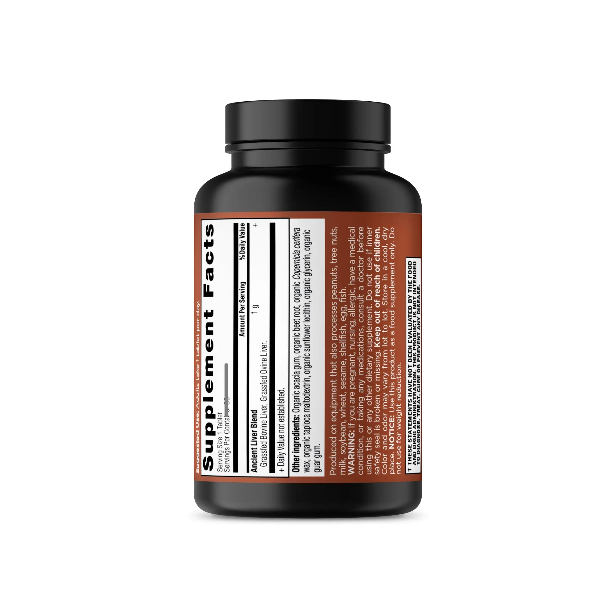 IngredientsAncient Liver Blend Grassfed Bovine Liver, Grassfed Ovine Liver. Other ingredients Organic acacia gum, organic beet root, organic Copernicia cerifera wax, organic tapioca maltodextrin, organic sunflower lecithin, organic glycerin, organic guar gum.