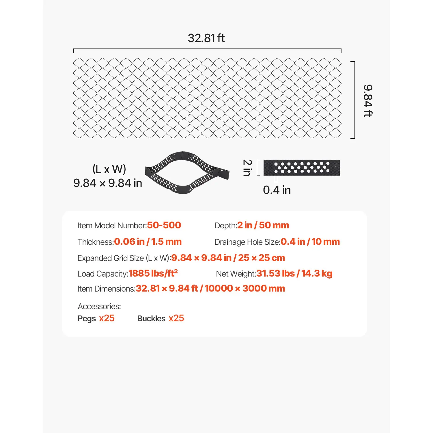 • 2-Inch Gravel Grid: Size: Each unit measures 32.81 ft long x 9.84 ft wide, covering 322.85 sq ft. The smaller units of 9.84in x 9.84in stabilize gravel or soil within each grid cell. The 2 inch deep ground grid is ideal for creating a firm surface on slopes or flat areas (especially on soft or unstable terrain). It also helps avoid further erosion and allows immediate foot or vehicle traffic