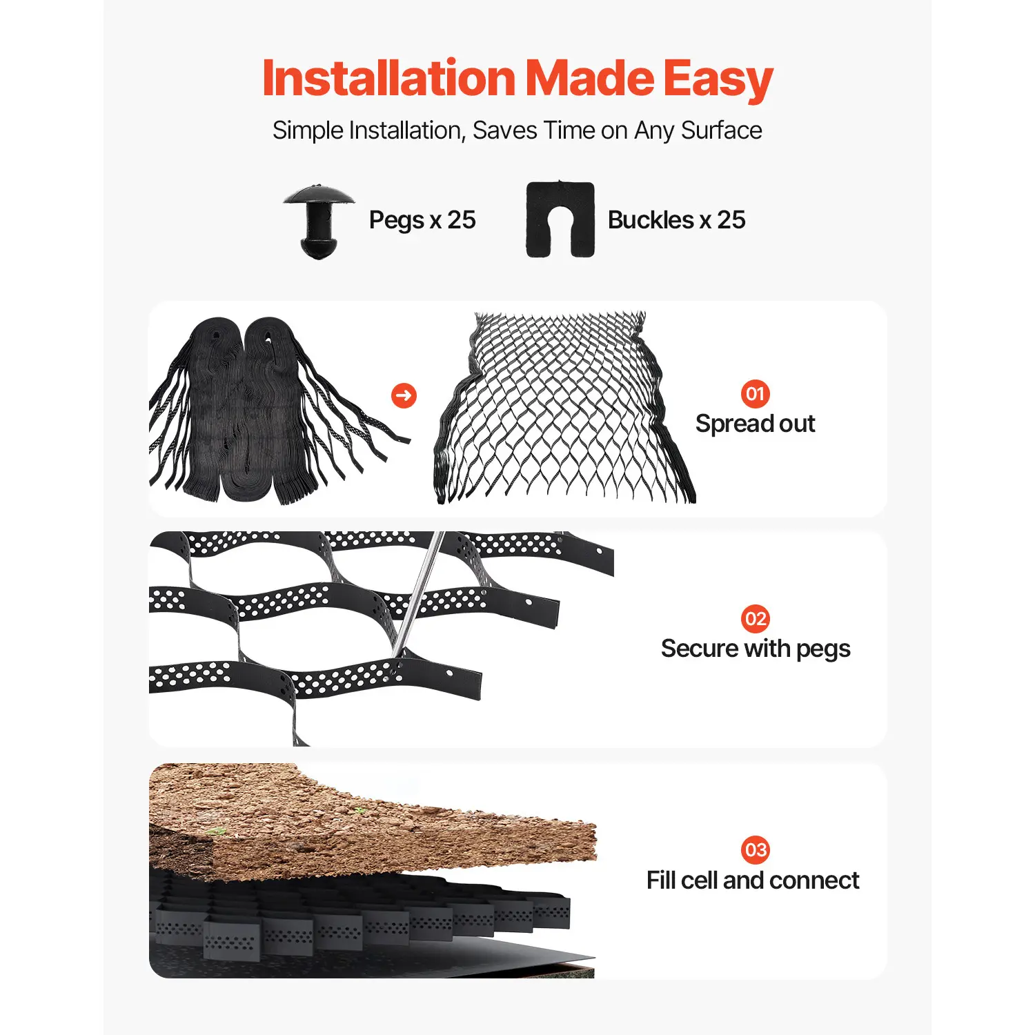 • Easy Installation & Application: Installing the geo ground grid system on patios, parking lots, landscaping, driveways, pavers, shed systems, etc., is quick and easy. Simply roll out the material, secure it to the ground, connect the components, and fill the cells with your desired material