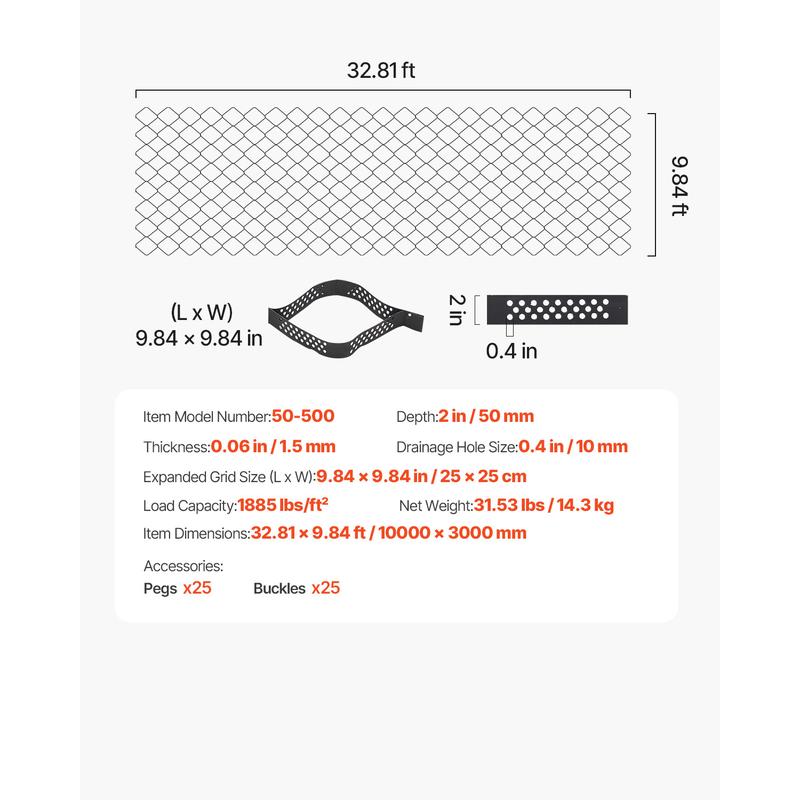 • 2-Inch Gravel Grid: Size: Each unit measures 32.81 ft long x 9.84 ft wide, covering 322.85 sq ft. The smaller units of 9.84in x 9.84in stabilize gravel or soil within each grid cell. The 2 inch deep ground grid is ideal for creating a firm surface on slopes or flat areas (especially on soft or unstable terrain). It also helps avoid further erosion and allows immediate foot or vehicle traffic