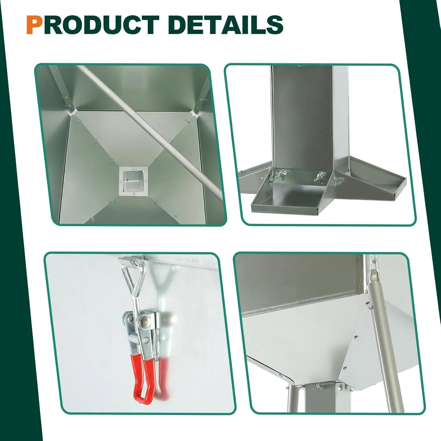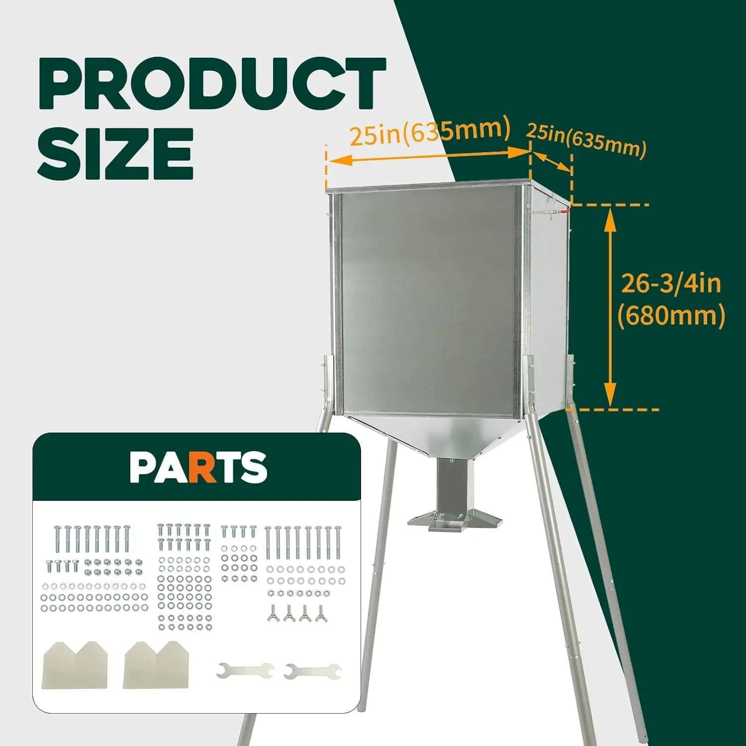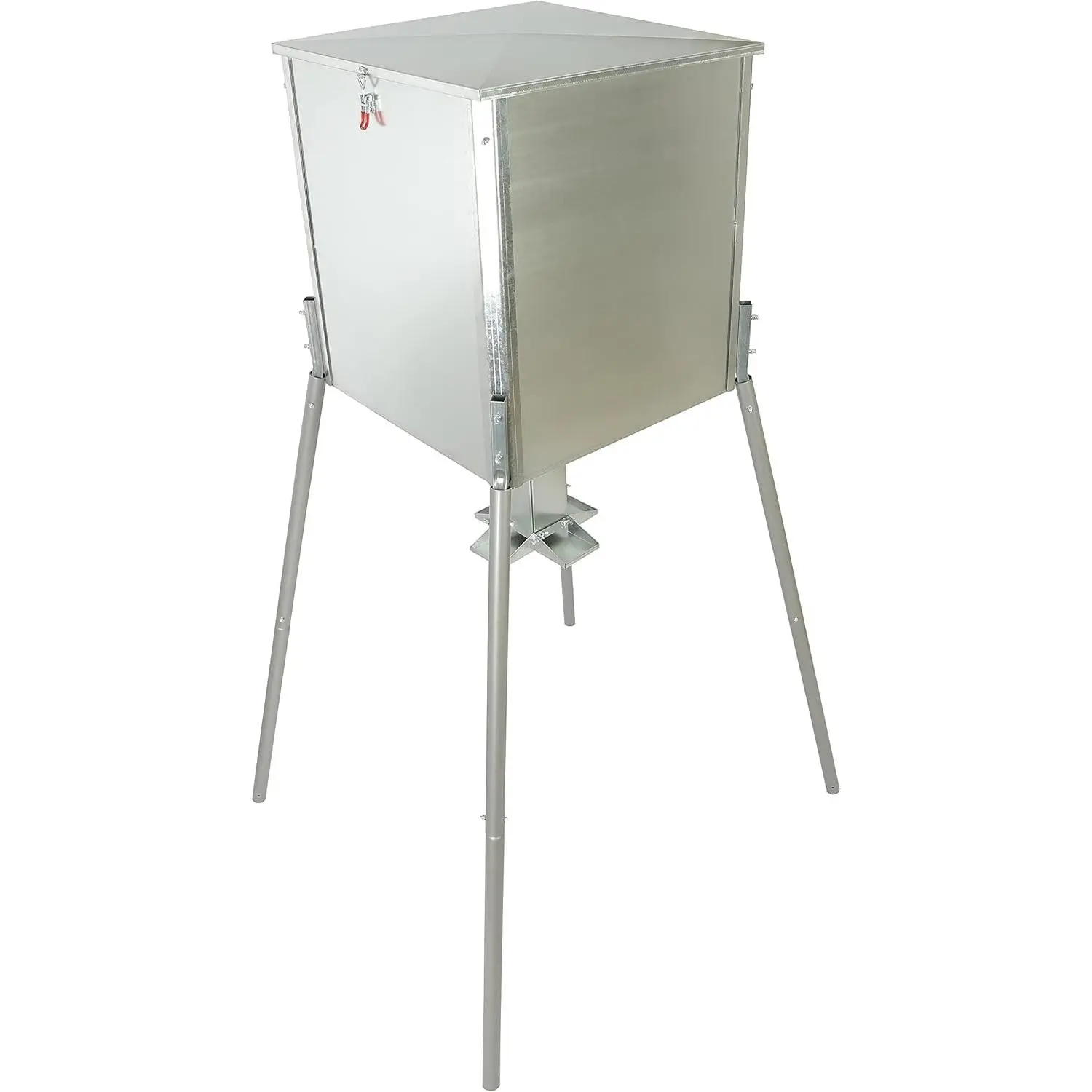 ·Product Parameters: Weight: 73lbs; Maximum Load: 450 lbs; Box Size: 30.12" x 27.17" x 5.51". Hopper Size: 25" x 25" x 27". 1 3/8" round galvanized legs; 4 way feed station; dual lid latches-adjustable tension