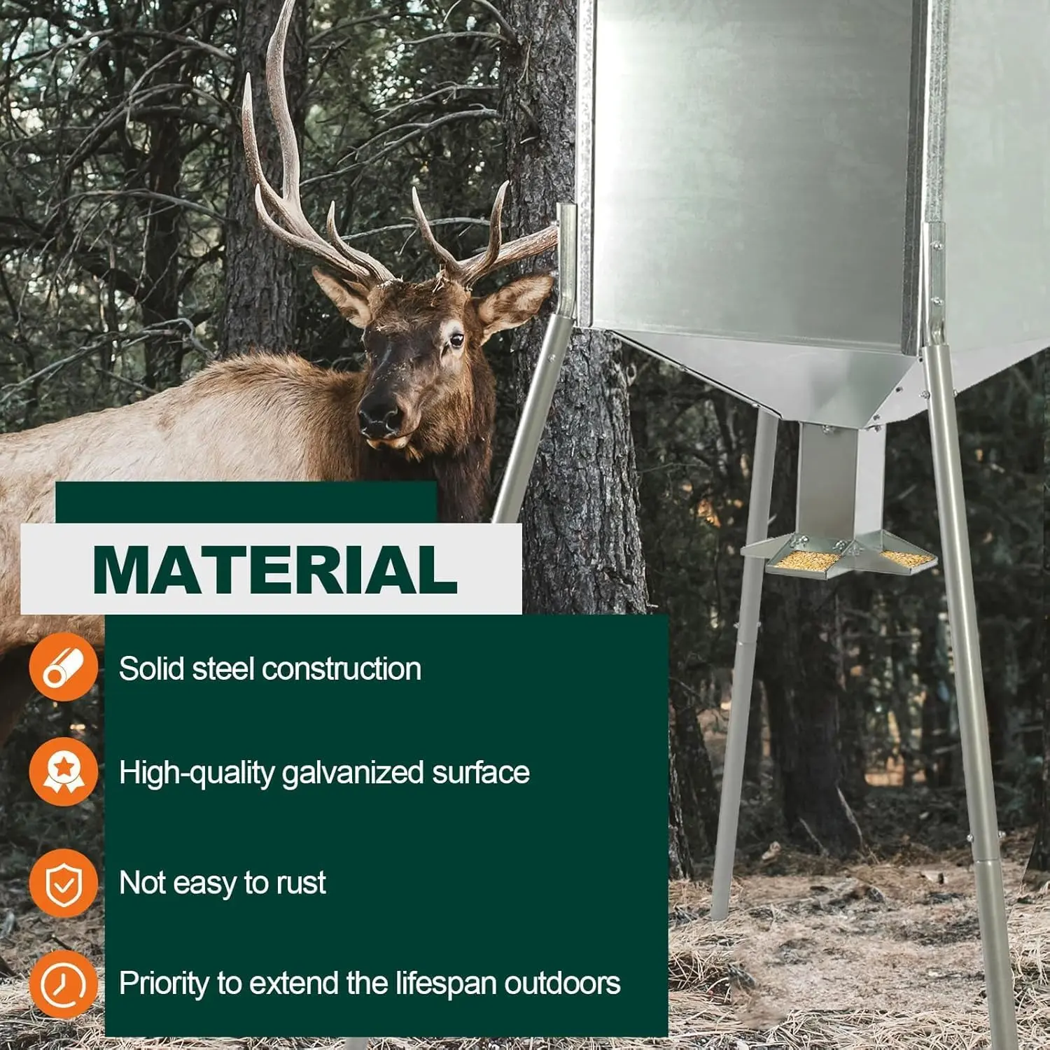 ·Flexibility for Protein Feeding: The gravity-based feeder hopper is designed to accommodate protein feeding, providing flexibility in nourishing the deer population with the necessary nutrition