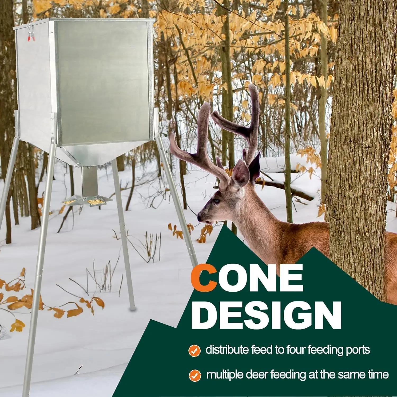 ·Unique Internal Design: The interior of the gravity deer feeder adopts a cone design, which can evenly distribute feed to all four feeding ports, which is conducive to multiple deer feeding at the same time