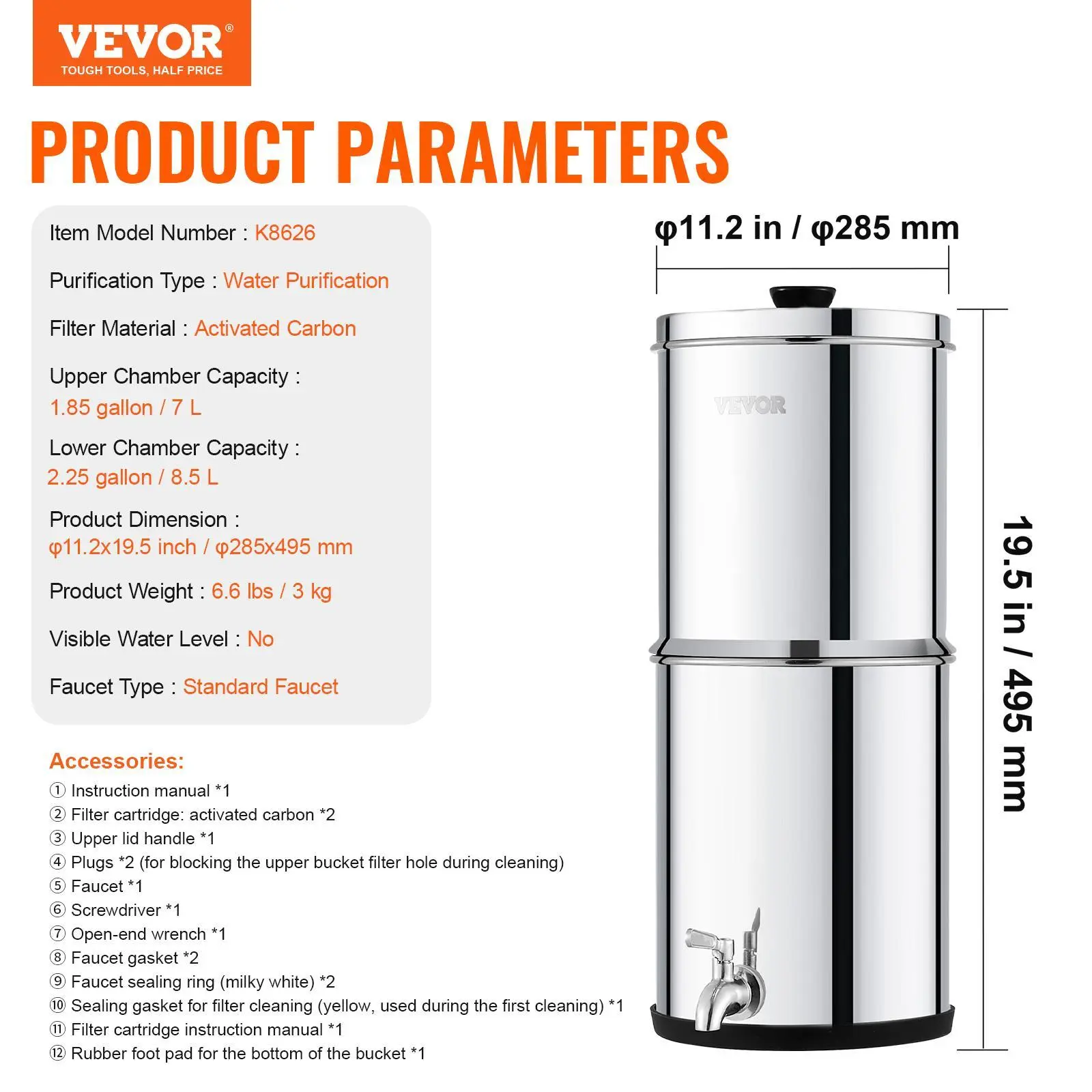 • Portable Large Capacity: The 2.25-gallon capacity meets the drinking needs of 1-4 people. The stainless steel countertop water filter uses compact design reduces the volume by half when stored, making it highly portable.