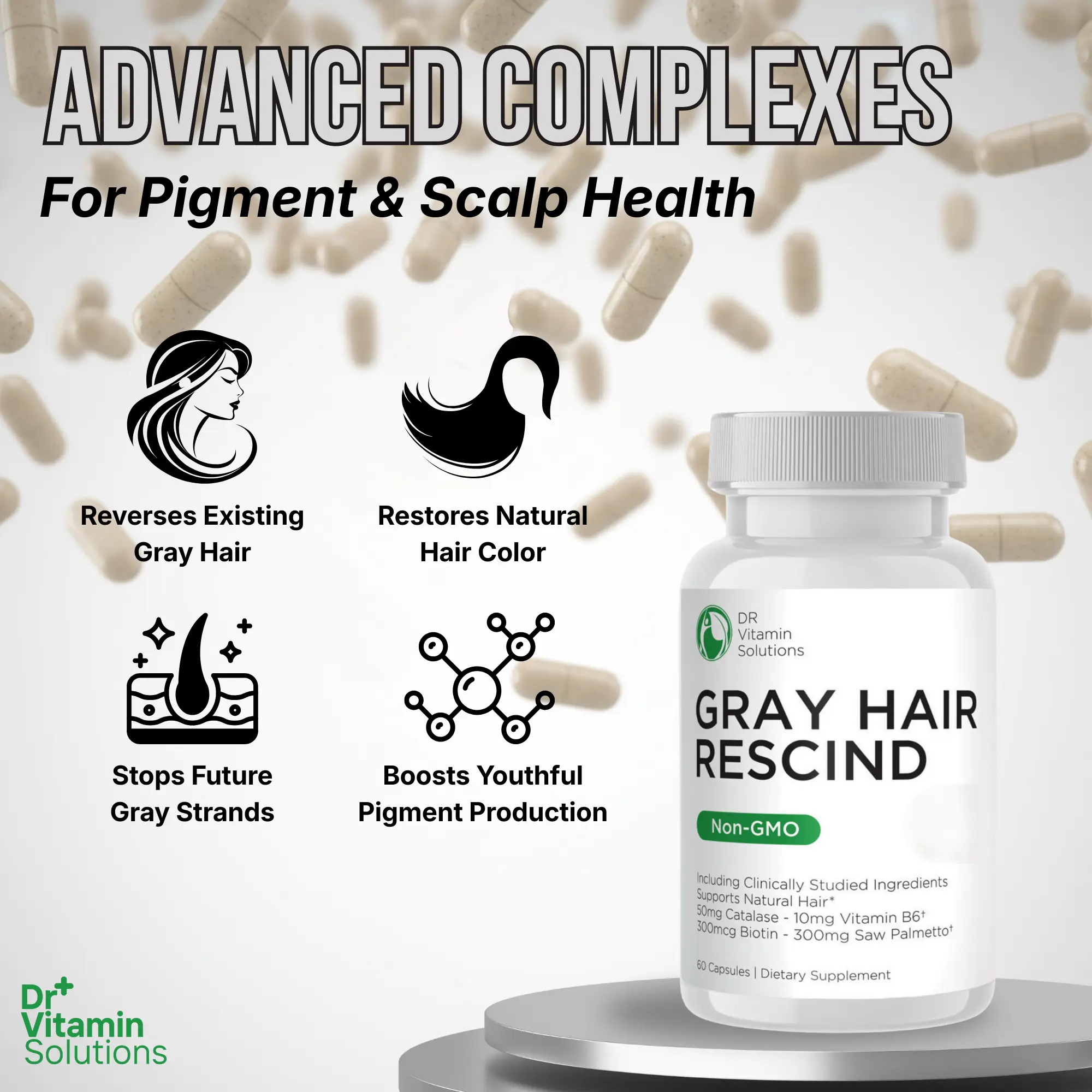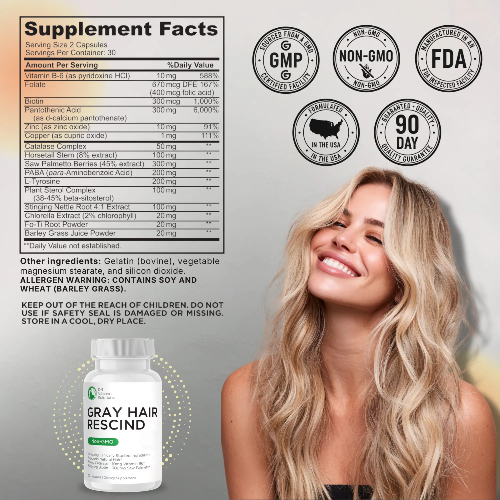 Gray Hair Rescind from DR Vitamin Solutions is a dietary supplement formulated with a unique blend of vitamins, minerals, and herbal ingredients that helps prevent and remove gray hair. This supplement is perfect for individuals who want to maintain their natural hair color while promoting overall health and beauty through healthy, nutritional means.