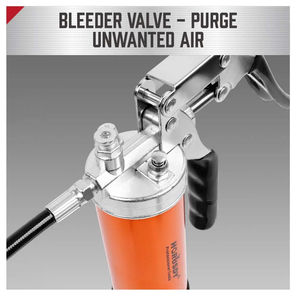 1. The Heavy Duty Pistol Grease Gun is the premium grease gun in the market, offering dependability and the best ergonomics. Its knurled thick wall barrel provides a secure grip, and its pistol grip allows for easy one-handed operation.