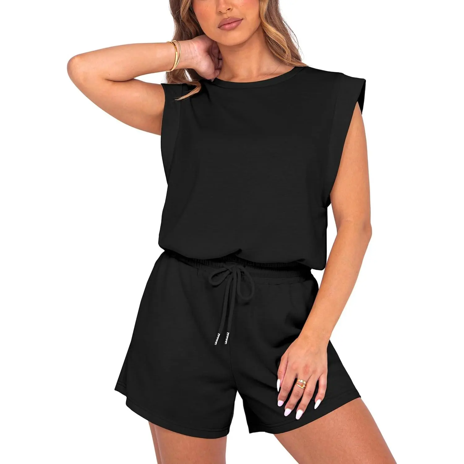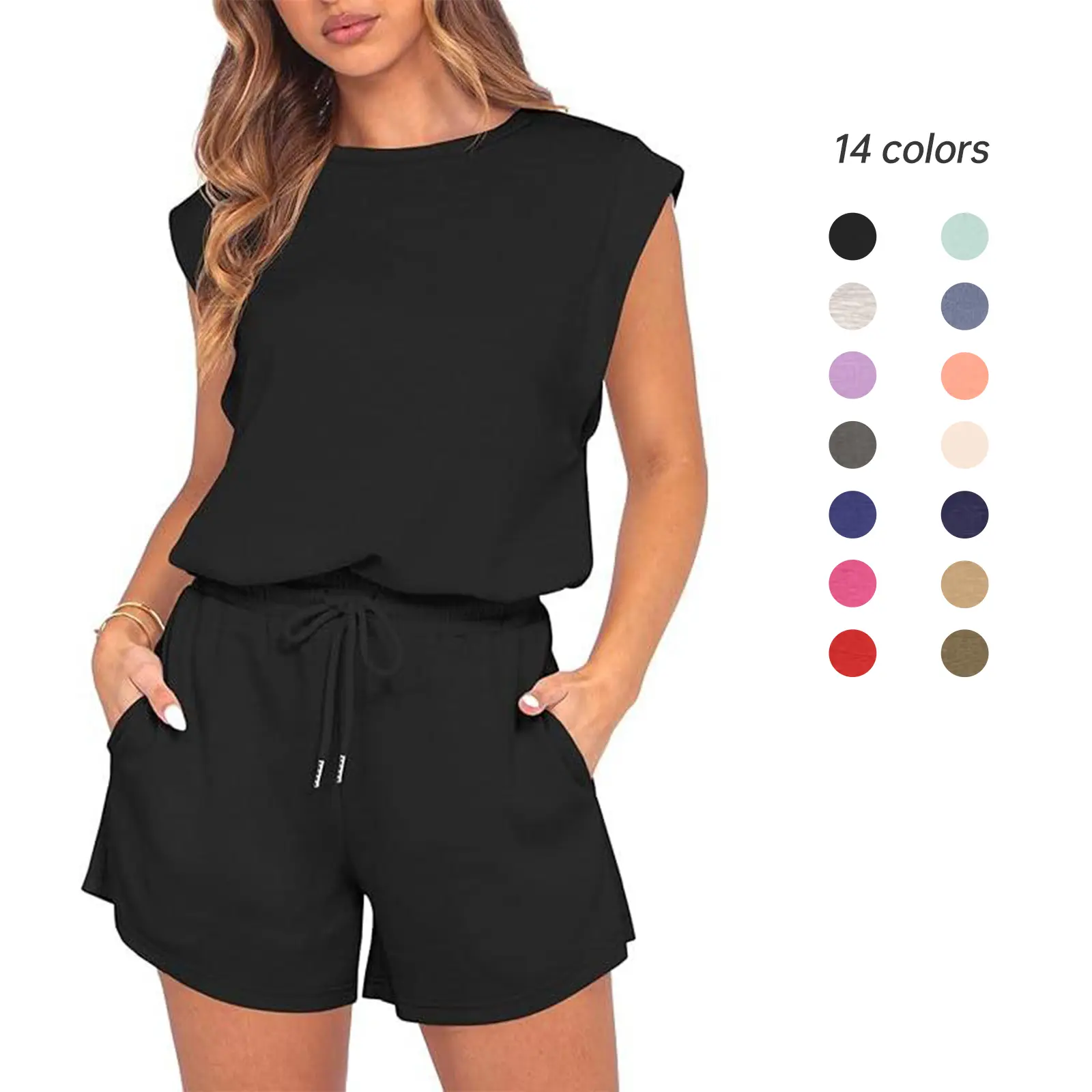 GRECERELLE Rompers For Women 2026 Summer Cap Sleeve Adjustable Drawstring Waistband Cozy Lounge Short Jumpsuit With Pocket
