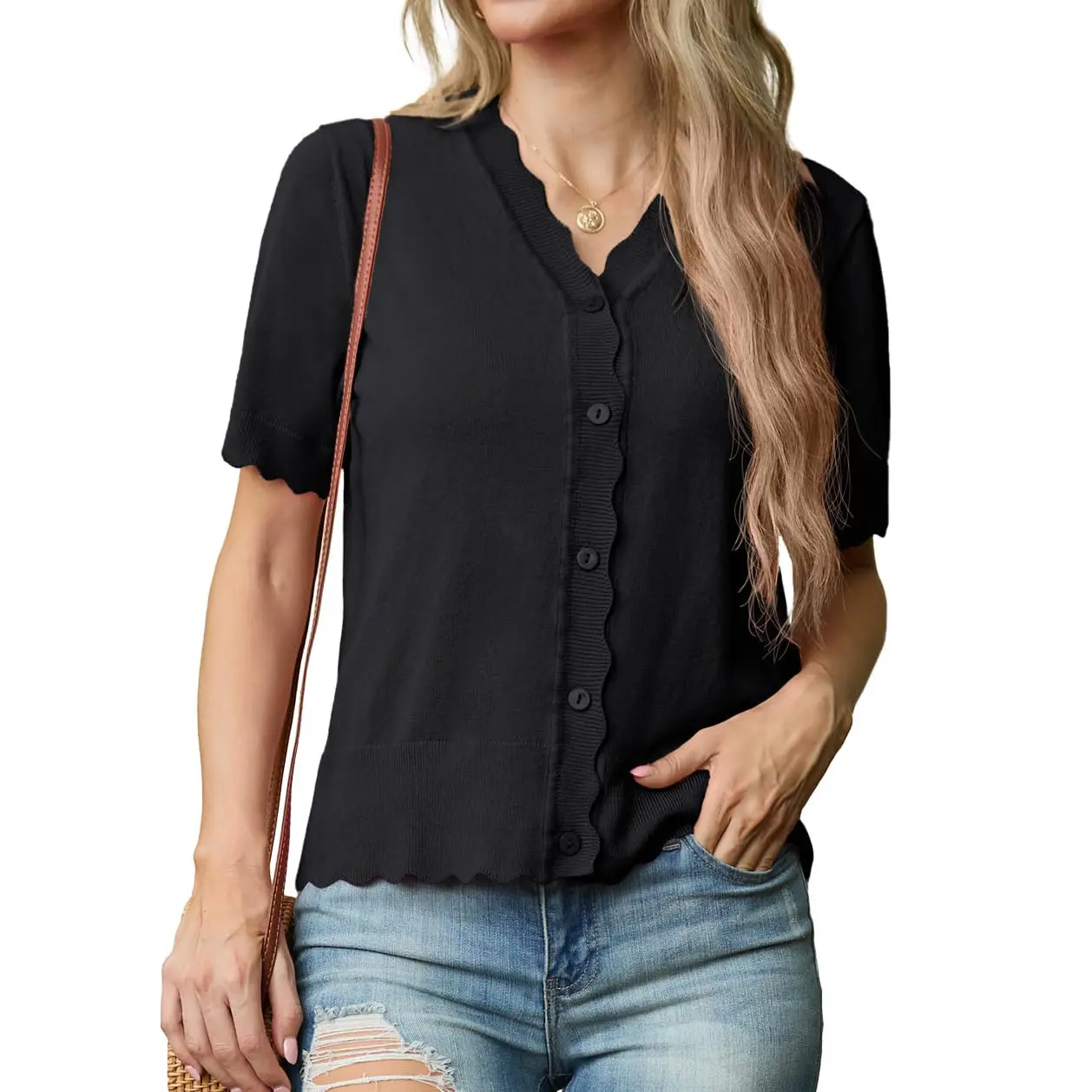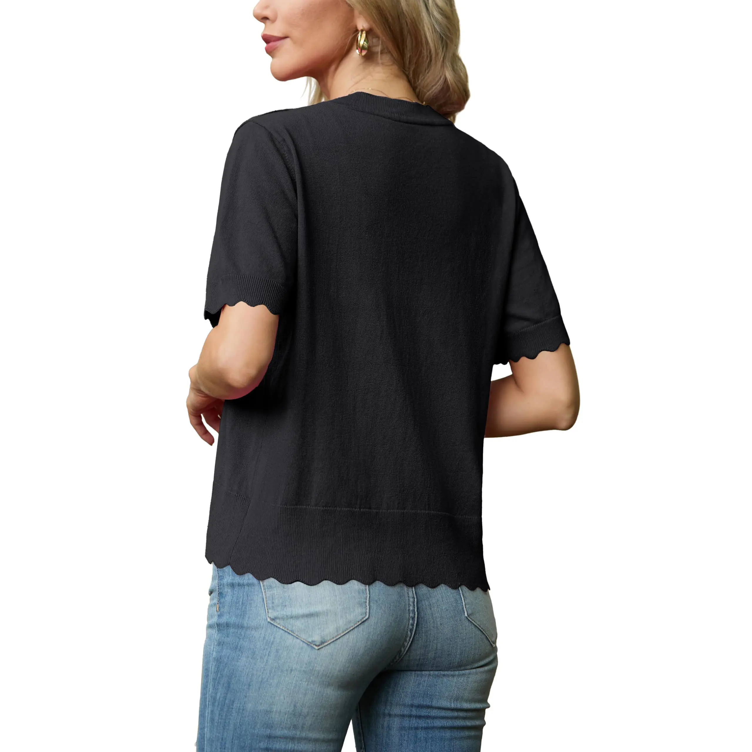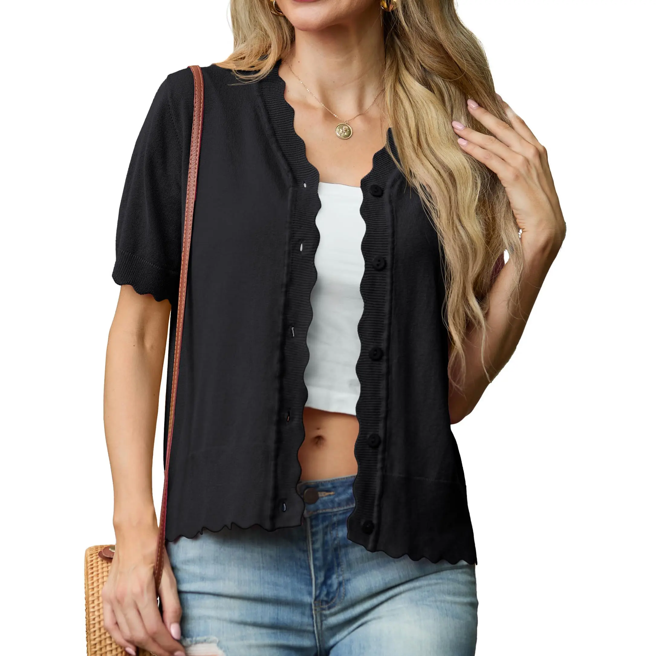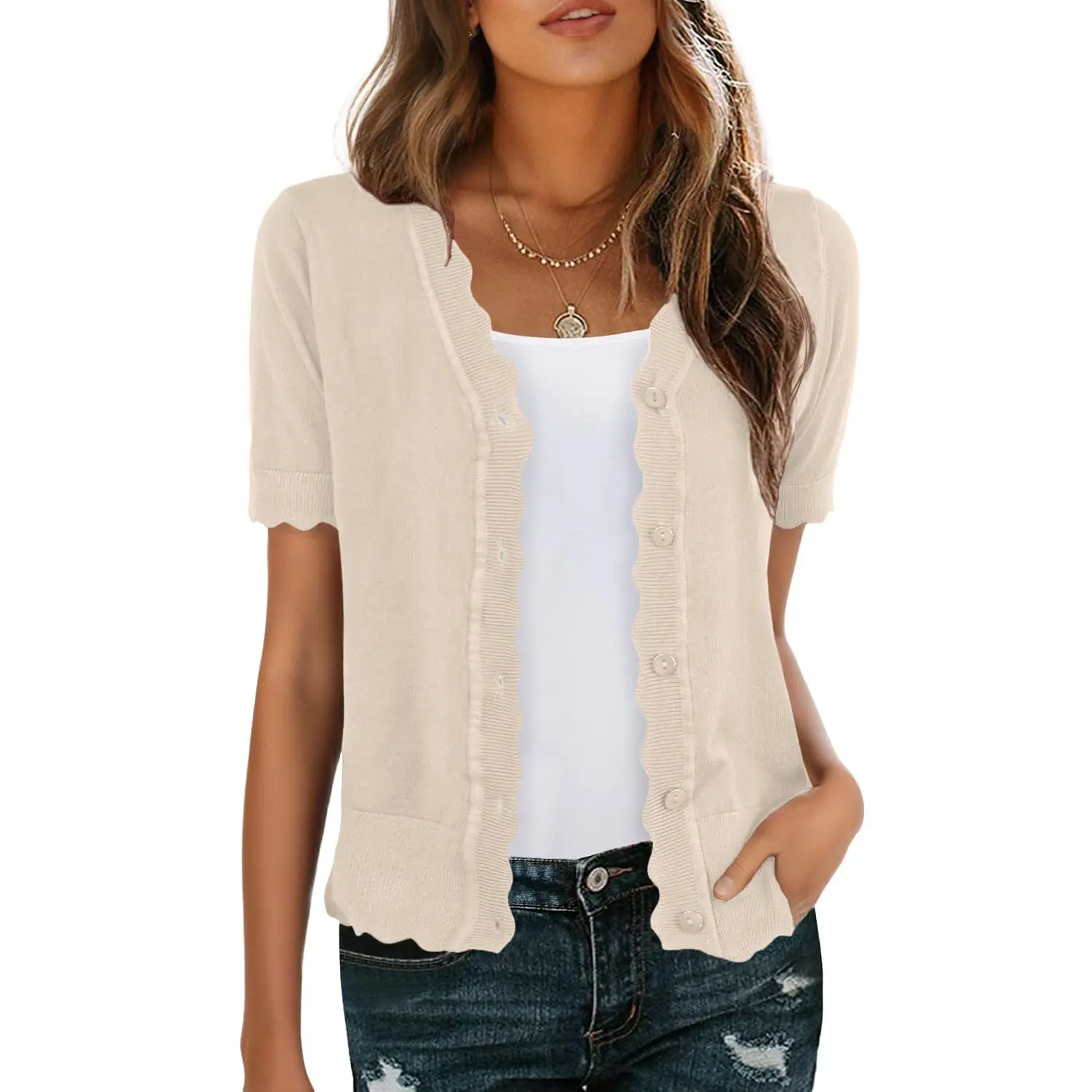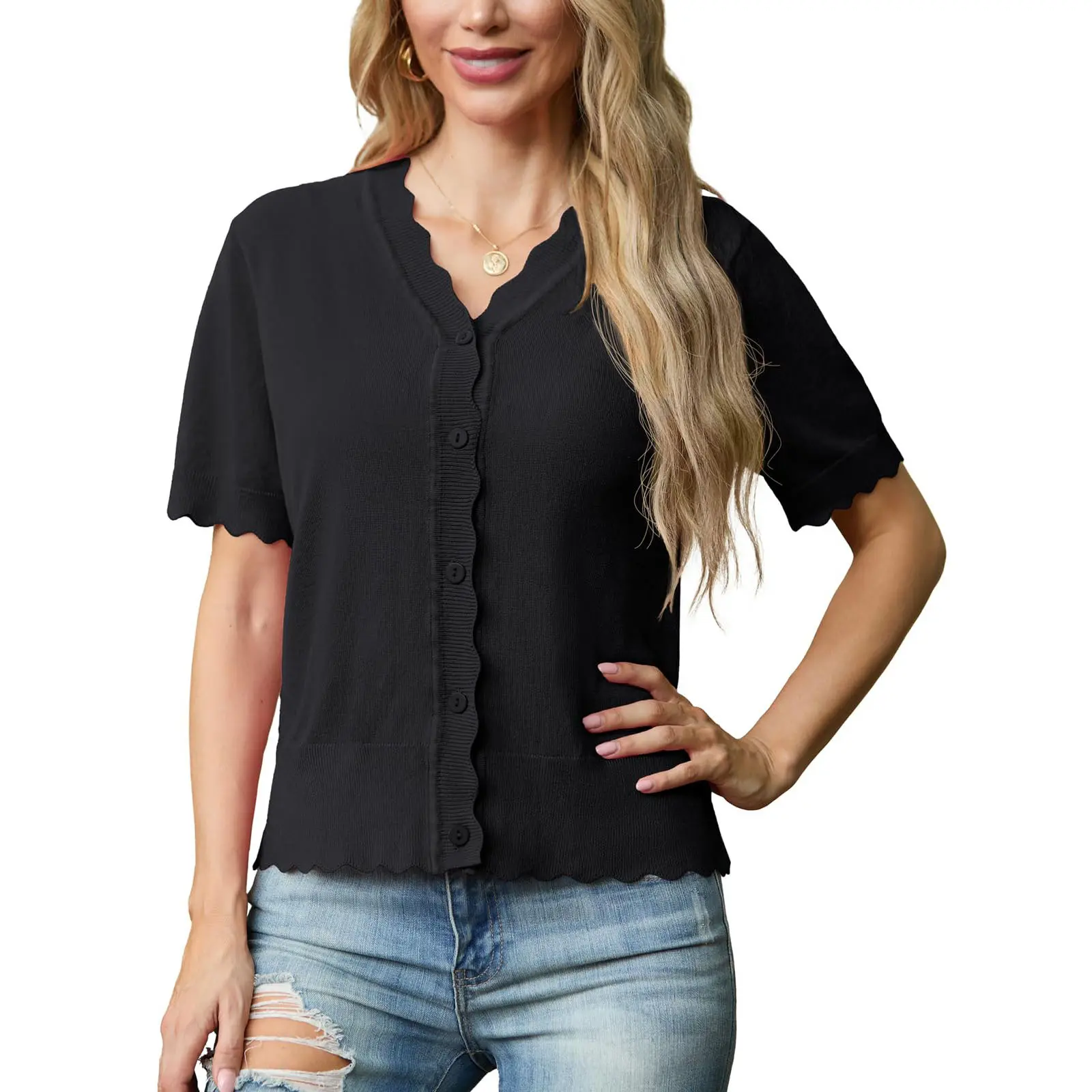 ·Women's short sleeve summer cardigan is designed with shell edges and matching colour buttons. Regular fit with excellent elasticity, perfect for many body types