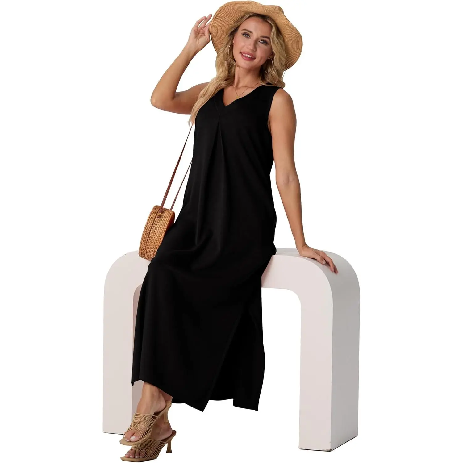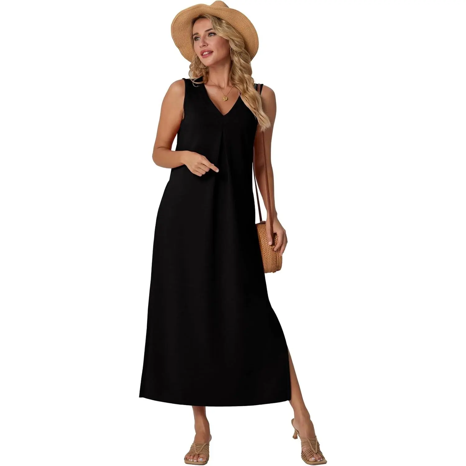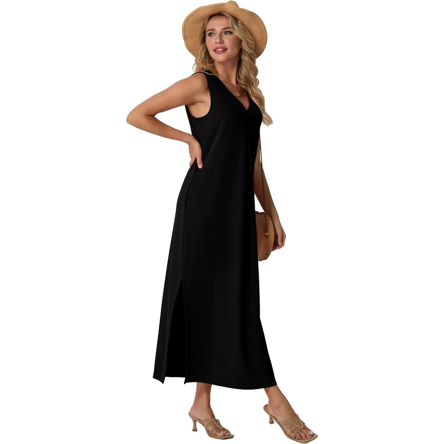 5. GRECERELLE Women 2026 Summer V-Neck Casual Loose Split Wrinkle-Free Long Maxi Vacation Dress with Pockets