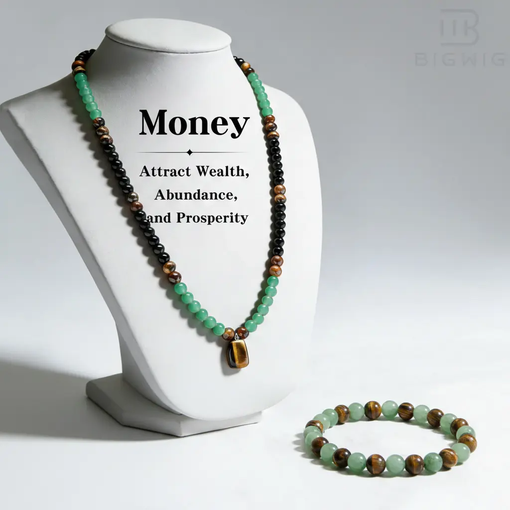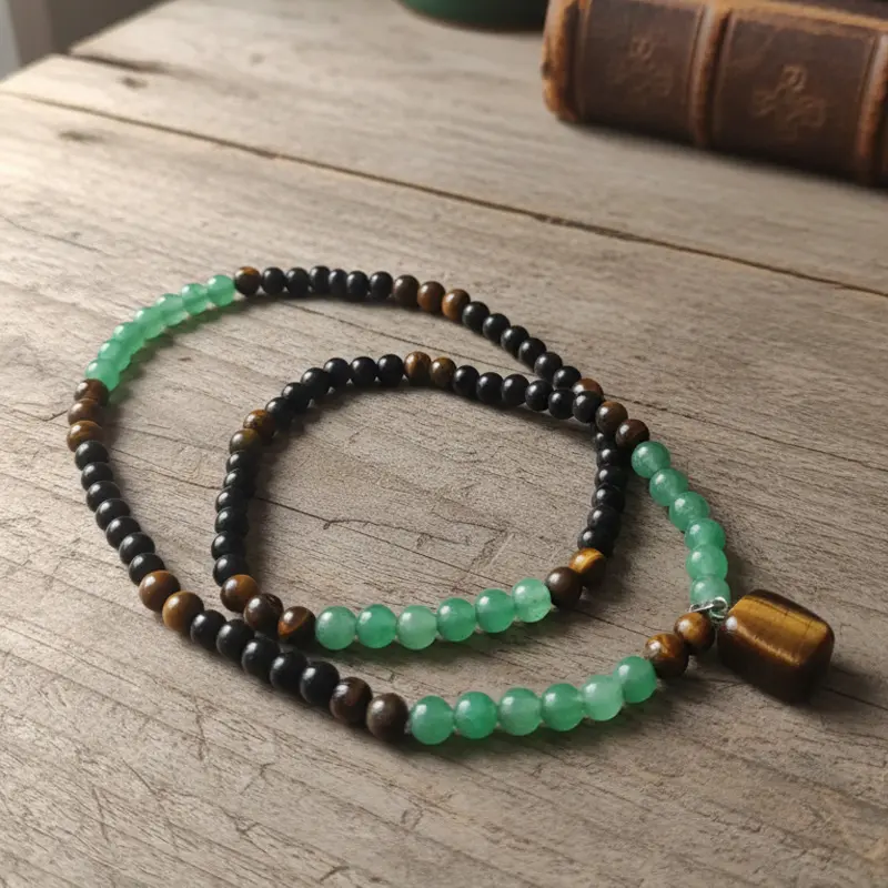 【GreenAventurine & Tiger Eye Pendant】 This necklace/bracelet features a healing crystal stone pendant, enhancing its appeal.